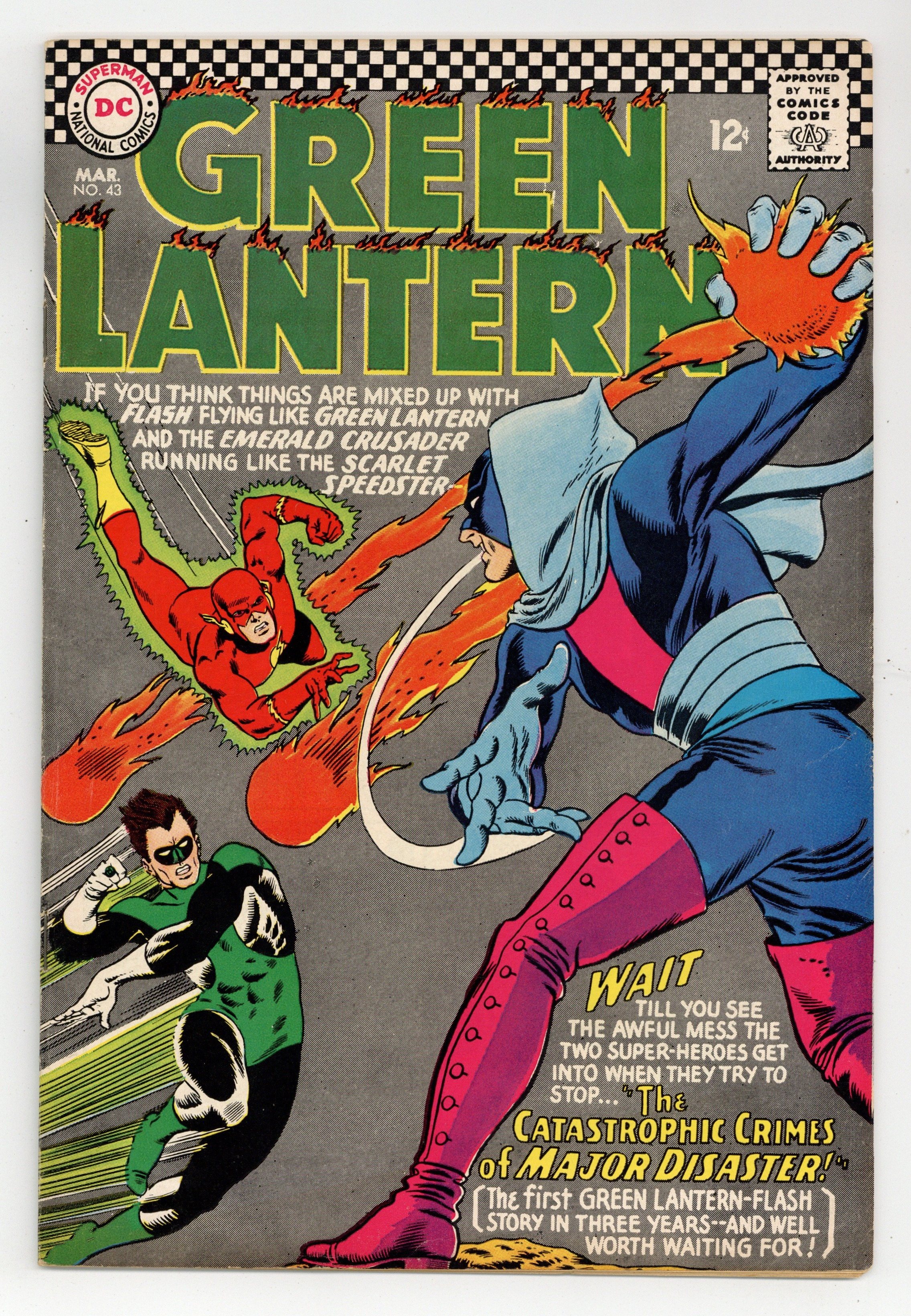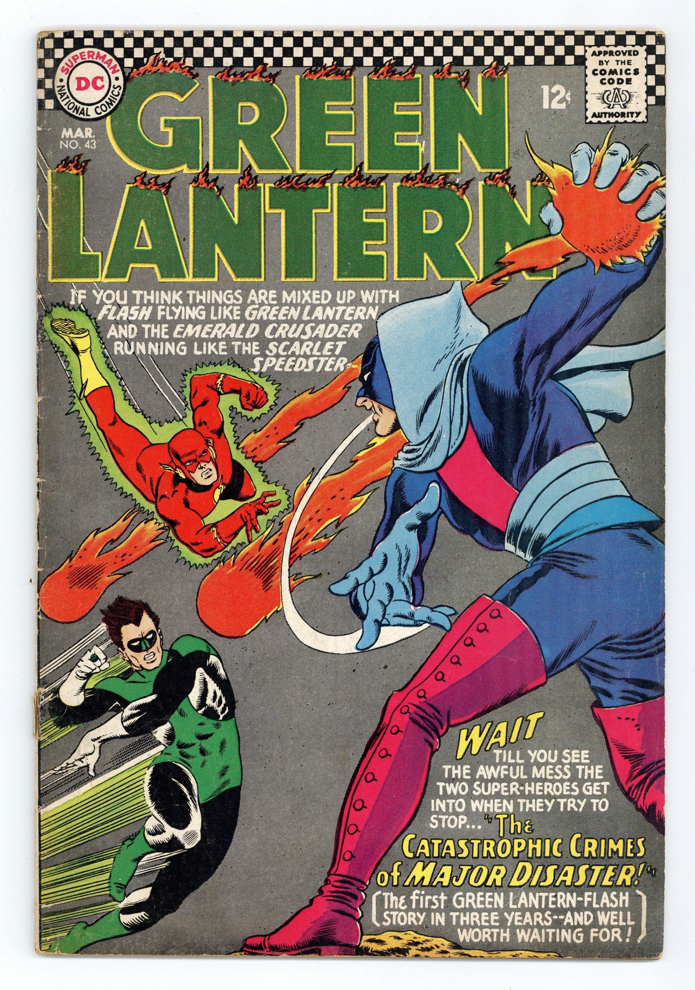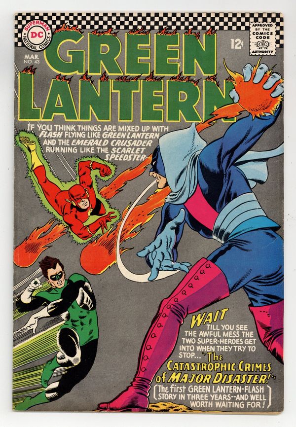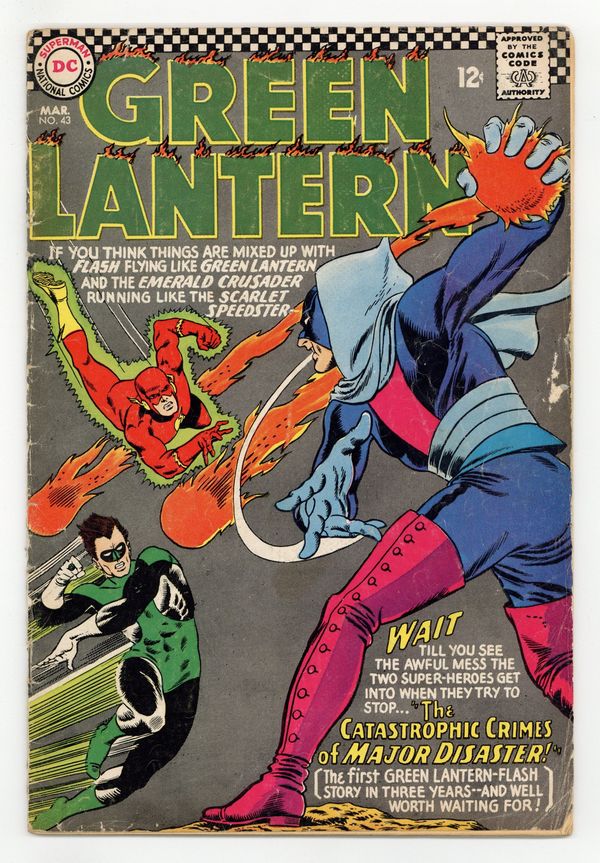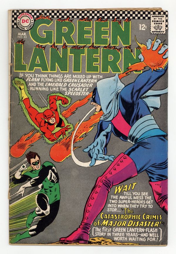 Cover pencils by Gil Kane, inks by Murphy Anderson. The Catastrophic Crimes of Major Disaster!, script by Gardner Fox, pencils by Gil Kane, inks by Sid Greene; A new villain uses disasters to committ his crimes, and Hal and Barry are having a hard time stopping him. 36 pgs. $0.12. Cover price $0.12.
