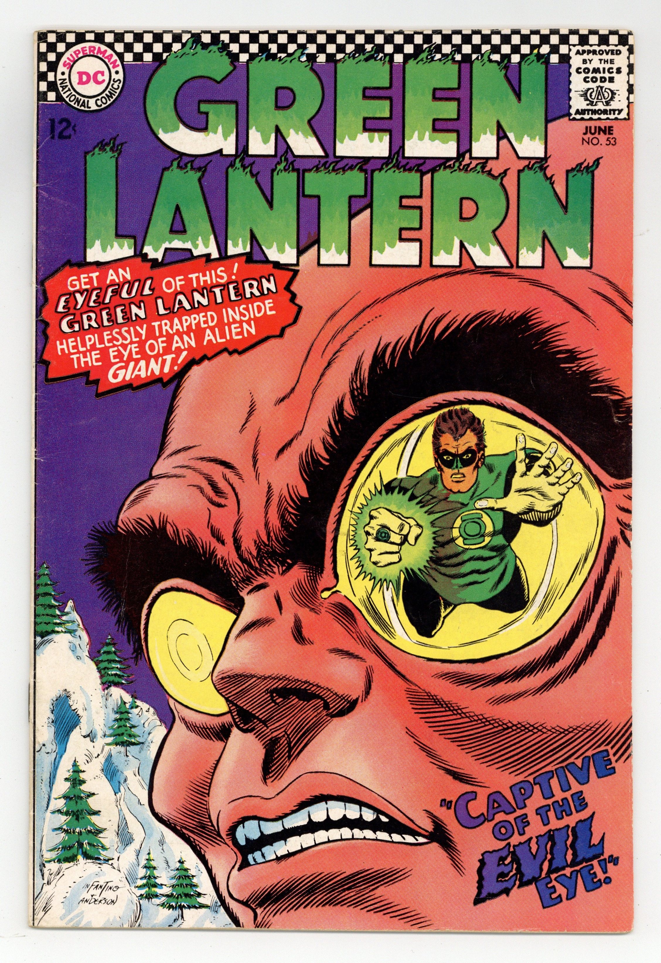 Cover pencils by Carmine Infantino, inks by Murphy Anderson. Captive of the Evil Eye!, script by John Broome, art by Gil Kane; Green Lantern fights a giant alien who is trying to steal the oxygen in the earth's atmosphere. Superman ad. The Flash/ The Spectre ad. Two Green Lanterns in the Family!,script by John Broome, pencils by Carmine Infantino, inks by Sid Greene; Hal's sister-in-law believes that her husband Jim is Green Lantern. Letter to the editor from comic writer Mark Evanier. 36 pgs., full color. $0.12. Cover price $0.12.