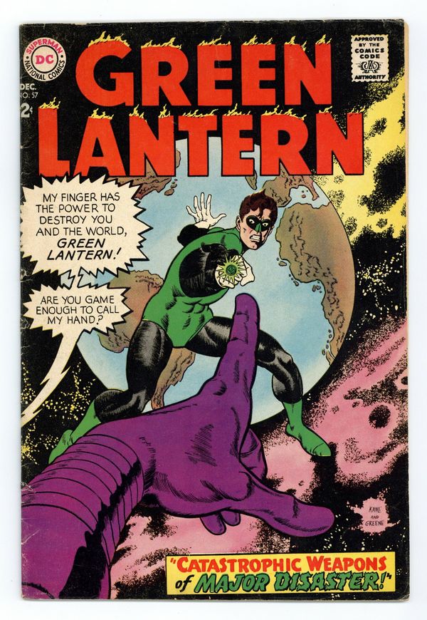 Tags: Green Lantern$13.50Cover pencils by Gil Kane, inks by Sid Greene. Catastrophic Weapons of Major Disaster!, script by Gardner Fox, art by Gil Kane; Major Disaster uses his knowledge of Green Lantern's secret identity to distract GL from his latest robbery plans. Tales of the Bizarro World ad. Adventures of Bob Hope ad. Cap's Hobby Hints by Henry Boltinoff. Deadman/The Spectre ad. Letter to the editor from writer Peter Sanderson. 36 pgs., full color. $0.12. Cover price $0.12.
