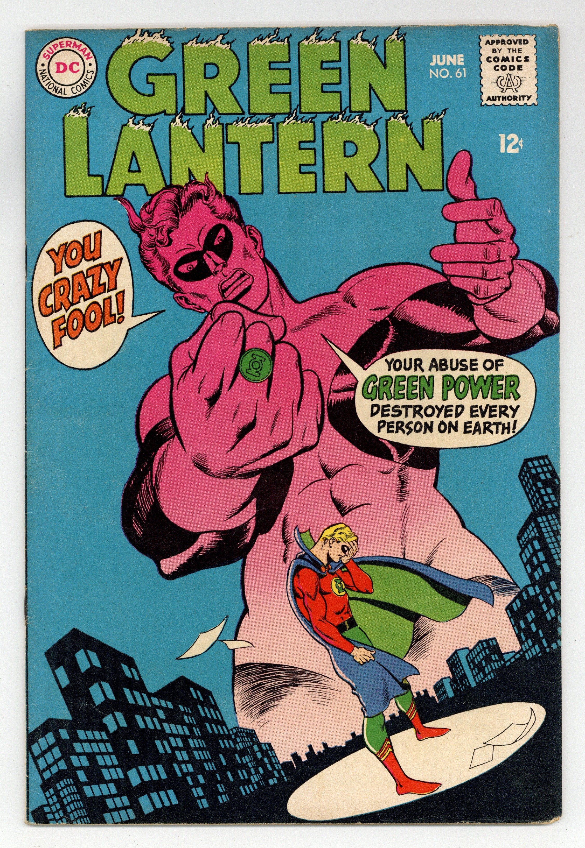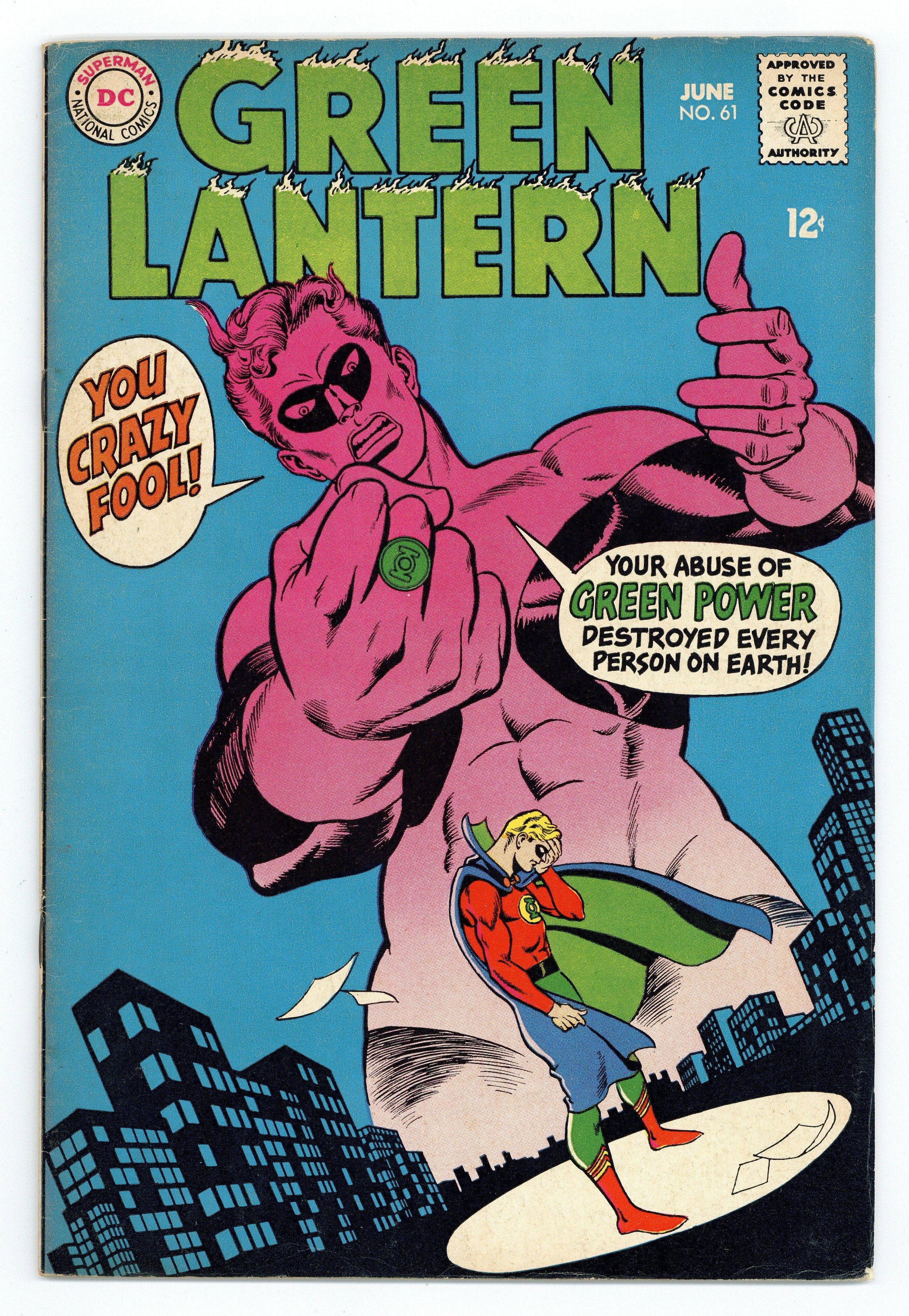Cover pencils by Gil Kane, inks by Sid Greene. Thoroughly Modern Mayhem!, script by Mike Friedrich, pencils by Gil Kane, inks by Sid Greene; When a villain from Earth-Two, Captain Challenge, travels to Earth-One to try and commit crimes, Hal Jordan calls in his pal Alan Scott, the Green Lantern from Captain Challenge's universe; During the fight, Hal has to hold back because Challenge is using a ray that fires yellow beams, however Alan -- his power-ring having no weakness to yellow -- goes into the fray and easily defeats his foe. 36 pgs., full color. $0.12. Cover price $0.12.