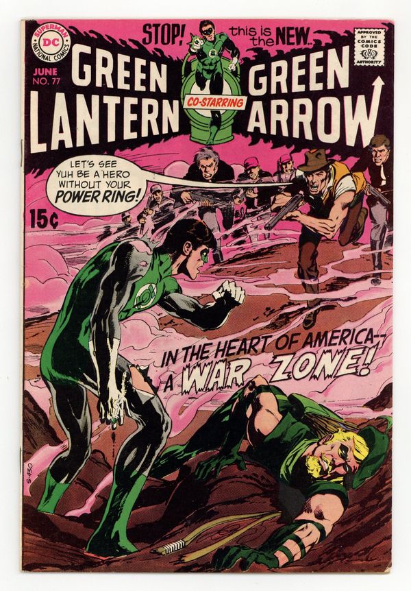 Cover art by Neal Adams. Journey to Desolation, script by Denny O'Neil, pencils by Neal Adams, inks by Frank Giacoia; Green Lantern, Green Arrow, and the Old-Timer come across the company town of Desolation, where the boss Slapper Soames plans to execute Johnny Walden to silence the songs he sings which have inspired the people of Desolation to think about a better way of life; As Green Lantern joins the townspeople in attacking Soames' stronghold, the Guardians inform him that since he is on a leave of absence they have reduced the power of his ring; But even weakened, Green Lantern and Green Arrow are able to free Johnny and turn Soames and his men over to the authorities. Letters to the editor from comic writers Don McGregor and Mike Barr. 36 pgs. $0.15. Cover price $0.15.