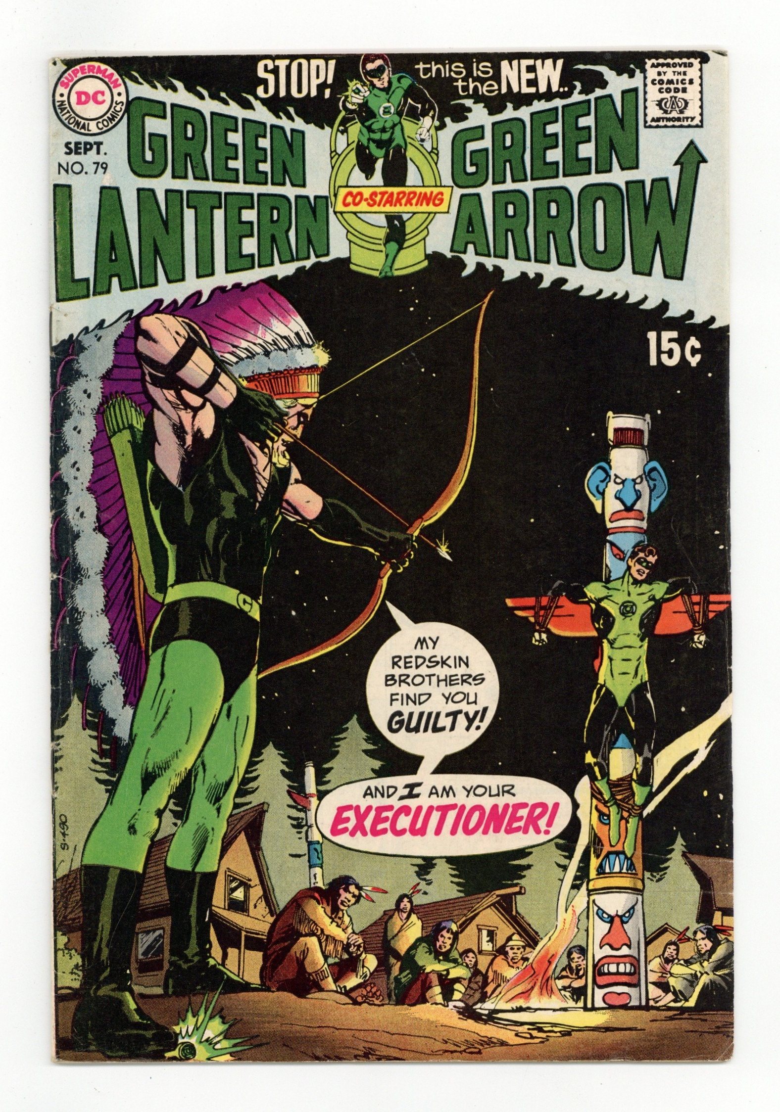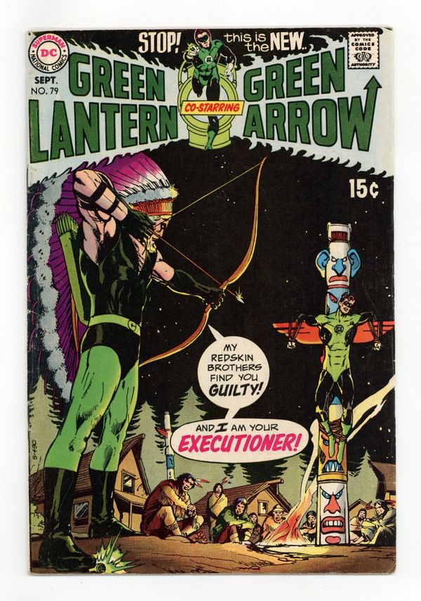 Cover art by Neal Adams. Ulysses Star Is Still Alive!, script by Denny O'Neil, pencils by Neal Adams, inks by Dan Adkins; Green Lantern and Green Arrow get involved in a dispute over logging rights on Native American land. While GL searches for documentation for the Indians' claim, GA tries to inspire them with the ghost of their ancestor; Though the heroes are able to prevent all-out conflict between the loggers and the Natives, and the leaders of the loggers are arrested, only time will tell if the Indians' claim will hold up in a court of law. Brief Black Widow appearance. 36 pgs. $0.15. Cover price $0.15.