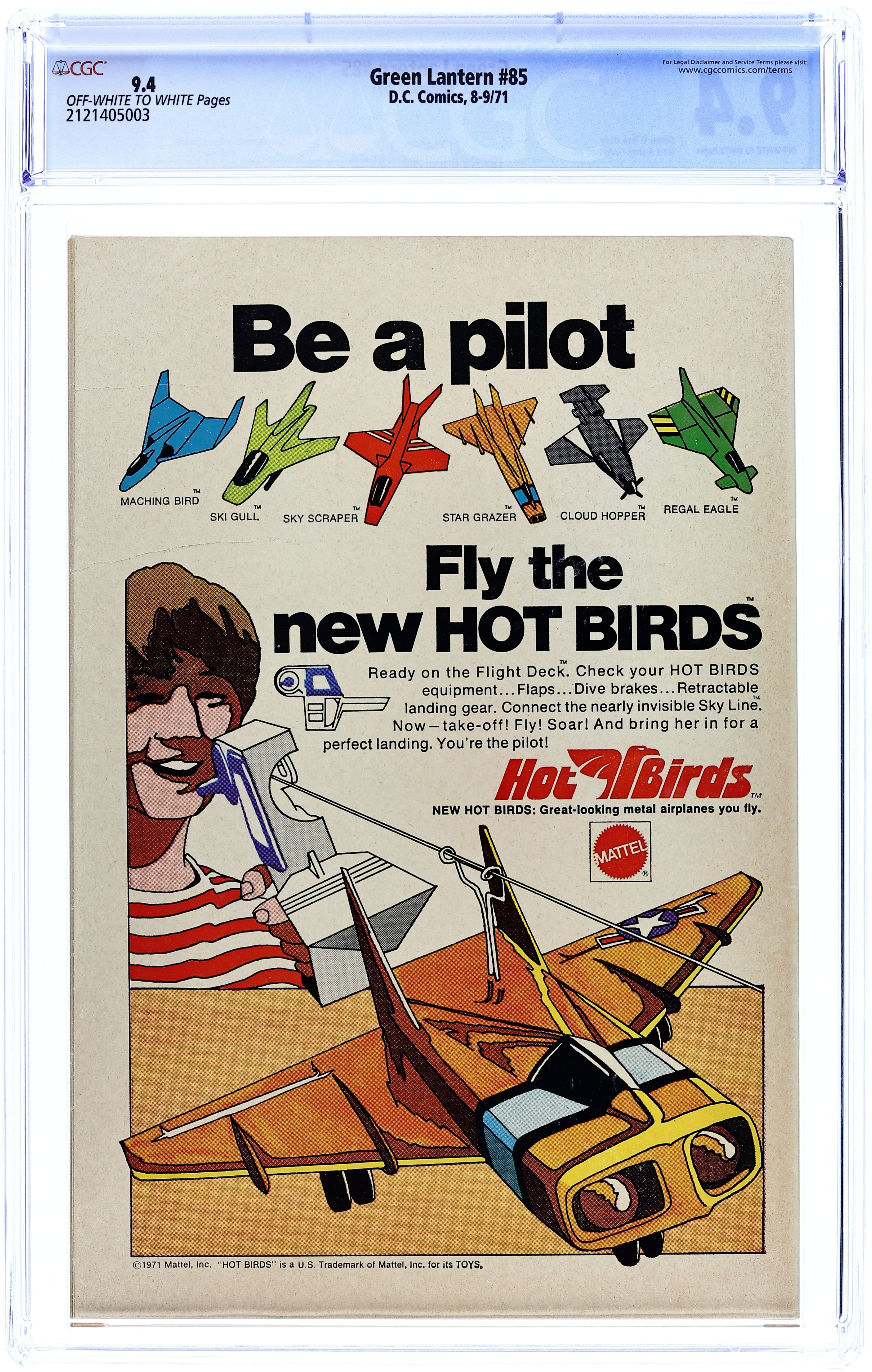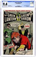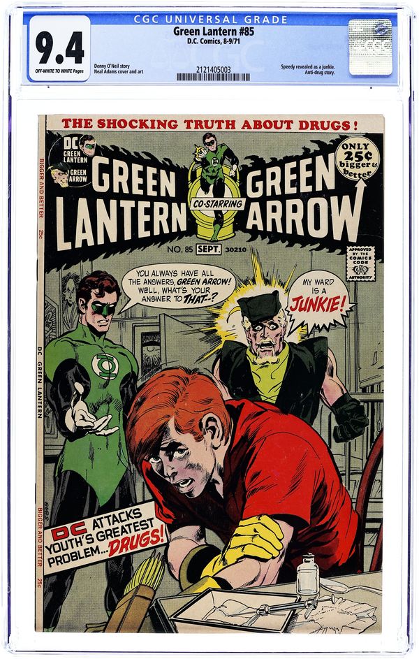 Giant-size issue. Cover art by Neal Adams. Snowbirds Don't Fly, script by Denny O'Neil, art by Neal Adams; When Oliver is jumped by junkies, he is shocked when one of them shoots him with one of his own arrows; Green Arrow, now teamed with Green Lantern, follows the leads to find the junkies, including the missing Roy Harper, who lets GA assume he has been working undercover; Later, the junkies lead the heroes to an airplane hangar, but help the dealers knock out GL and GA and inject them with drugs. Roy arrives in time to get the messed up duo home; There he tries to explain the attraction of doing drugs, but Green Arrow remains baffled, and is shocked to soon find Roy getting ready to shoot up. The Strange Trial of Green Lantern, script by John Broome, pencils by Gil Kane, inks by Joe Giella; Sinestro tries to mind control Hal Jordan; Hal's behavior gets him called before the Green Lantern Corps. 52 pgs. $0.25. Cover price $0.25.