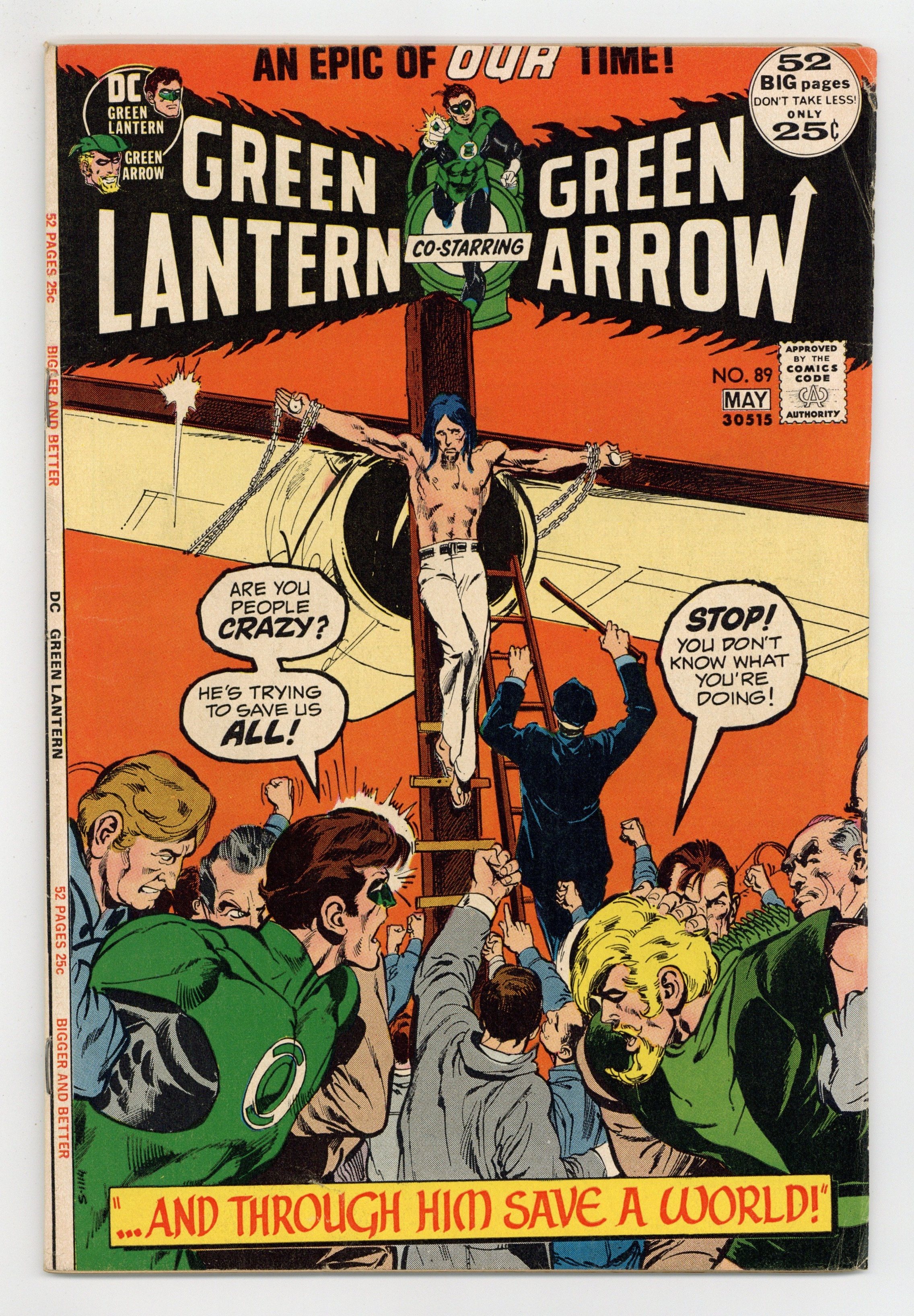Giant-size issue. Cover by Neal Adams. ...And through Him Save a World..., script by Denny O'Neil, pencils by Neal Adams, inks by Neal Adams; Green Arrow goes with Green Lantern and Carol Ferris to the Ferris Aircraft plant in Abraham, which has been the target of ecological prankster Isaac; When Isaac accidentally threatens Carol, GL tries to take him into custody, but GA gases him. Reprint back-up story: the Golden Age Green Lantern stars in The Impossible Mr. Paradox! (from the original Green Lantern 38, May 1949), script by John Broome, art by Irwin Hasen; The cancellation of Clay Chalmers' program at Station WXYZ leads Alan Scott to believe Chalmers is the new criminal haunting Gotham City, Mr. Paradox, who attempts to defeat Green Lantern by employing illusions based on scientific paradoxes. Tarzan ad. 52 pgs., full color. $0.25. Cover price $0.25.