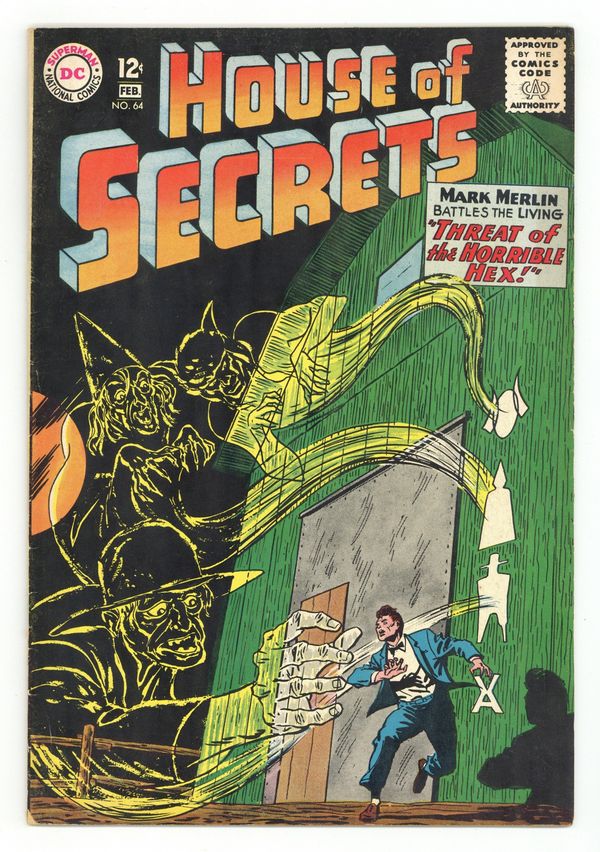 Starts Jan 26 Cover art by Bob Brown. "The Threat of the Horrible Hex," script by Arnold Drake, art by Mort Meskin; Mark and Elsa travel to central Pennsylvania to help a young woman escape from a curse on her family from the days of the colonial witch trials. Ad for Aquaman and Hawkman. Superman ad. Batman and Robin ad. 2/3-page The Great Houdini bio, art by Henry Boltinoff. "Hideout on Fear Island," script by Bob Haney, art by Alex Toth; Professor Bennett is accused of using a rapid-grow plant experiment by a small South-American country and destroying a village. Doom Patrol ad. 36 Pages, Full Color. Cover price $0.12.