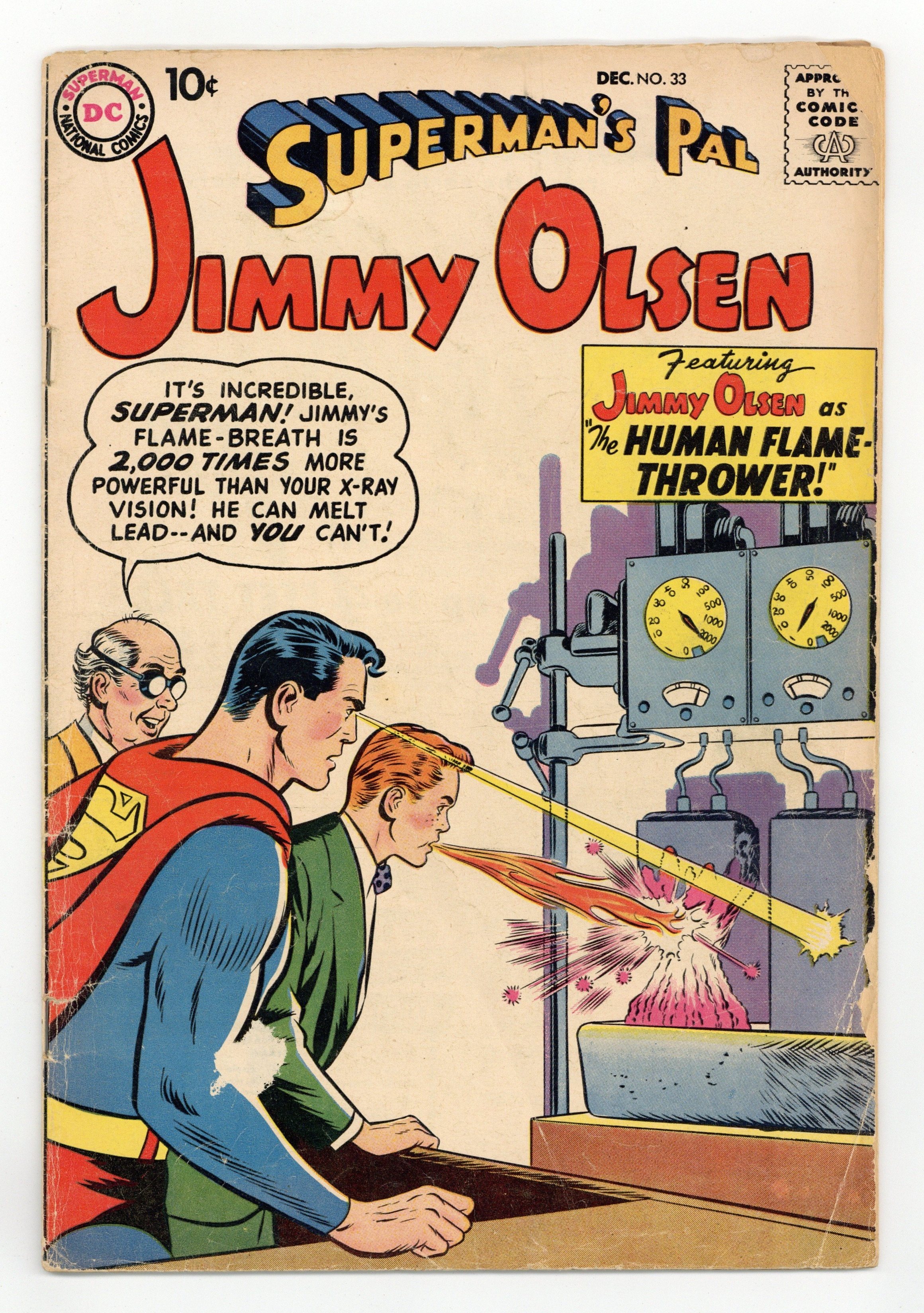 Tags: Superman$18.75Cover pencils by Curt Swan, inks by Stan Kaye. The Legends that Came to Life!, script by Otto Binder, pencils by Curt Swan, inks by Ray Burnley; Jack Frost, Jack (from Jack in the Beanstalk), and the Pied Piper come to life. The Lady-Killer from Metropolis!, script by Alvin Schwartz, pencils by Curt Swan, inks by Ray Burnley. Supergram The Superman Puzzle Game. Meet TV's Jimmy Olsen article bio on Jack Larsen. The Human Flame-Thrower!, script by Otto Binder, pencils by Curt Swan, inks by Ray Burnley; An accident involving an experiment of Prof. Potter's gives Jimmy fire-breath. 36 Pages, Full Color. Cover price $0.10.