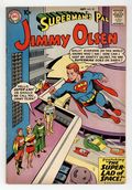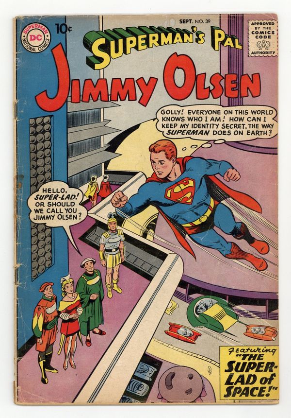 Cover pencils by Curt Swan, inks by Stan Kaye. The Super-Lad of Space!; Jimmy, while wearing a Superman costume, attends the launching of an engineless rocket into outer space by Superman. The Million-Dollar Mistakes!; Jimmy watches $1,000,000 blow out of a window; Superman rescues the money, but Jimmy's luck runs true, as he builds up to another $1,000,000 debt. Jimmy Olsen's Super-Signals! Scripts by Robert Bernstein, pencils by Curt Swan, inks by John Forte. 36 Pages, Full Color. Cover price $0.10.