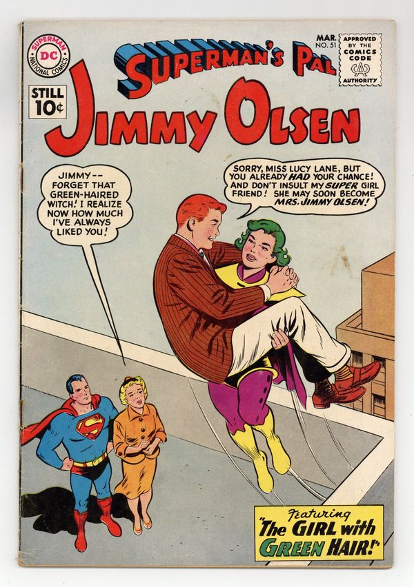 Cover pencils by Curt Swan, inks by Stan Kaye. Jimmy Olsen's 1,000th Scoop!, script by Robert Bernstein, pencils by Curt Swan, inks by John Forte; an alien invader kidnaps and impersonates Perry White. Don't Sell Nature Short! public service announcement, script by Jack Schiff, art by Bernard Baily. The Girl with Green Hair!, script by Otto Binder, pencils by Curt Swan, inks by John Forte; a green-haired alien female chooses Jimmy as Earth's most handsome man. The Dream Detective!, pencils by Curt Swan, inks by Stan Kaye. Moolah the Mystic humor page by Henry Boltinoff. Statement of ownership--average paid circulation 492,000. 36 Pages, Full Color. Cover price $0.10.