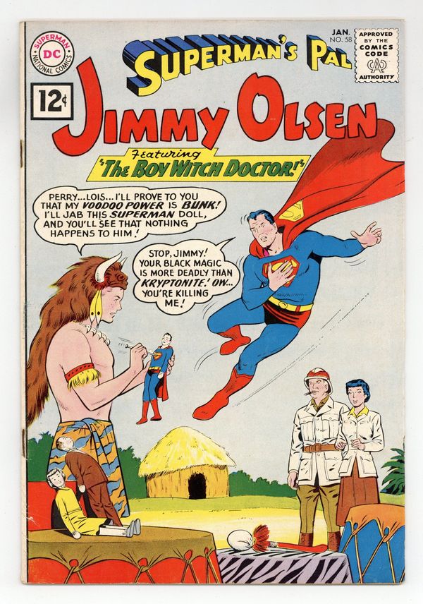 Cover pencils by Curt Swan, inks by George Klein. Jimmy the Soda Jerk!, script by Robert Bernstein, pencils by Curt Swan, inks by George Klein; to bust an ex-con, Jimmy gets a job as a soda jerk. Jimmy Olsen's Super-Birthday!, art by John Forte. Peg humor page by Henry Boltinoff. The Boy Witch Doctor, script by Jerry Siegel, pencils by Curt Swan, inks by George Klein; Jimmy becomes a Witch Doctor while visiting natives on an island. 36 Pages, Full Color. Cover price $0.12.