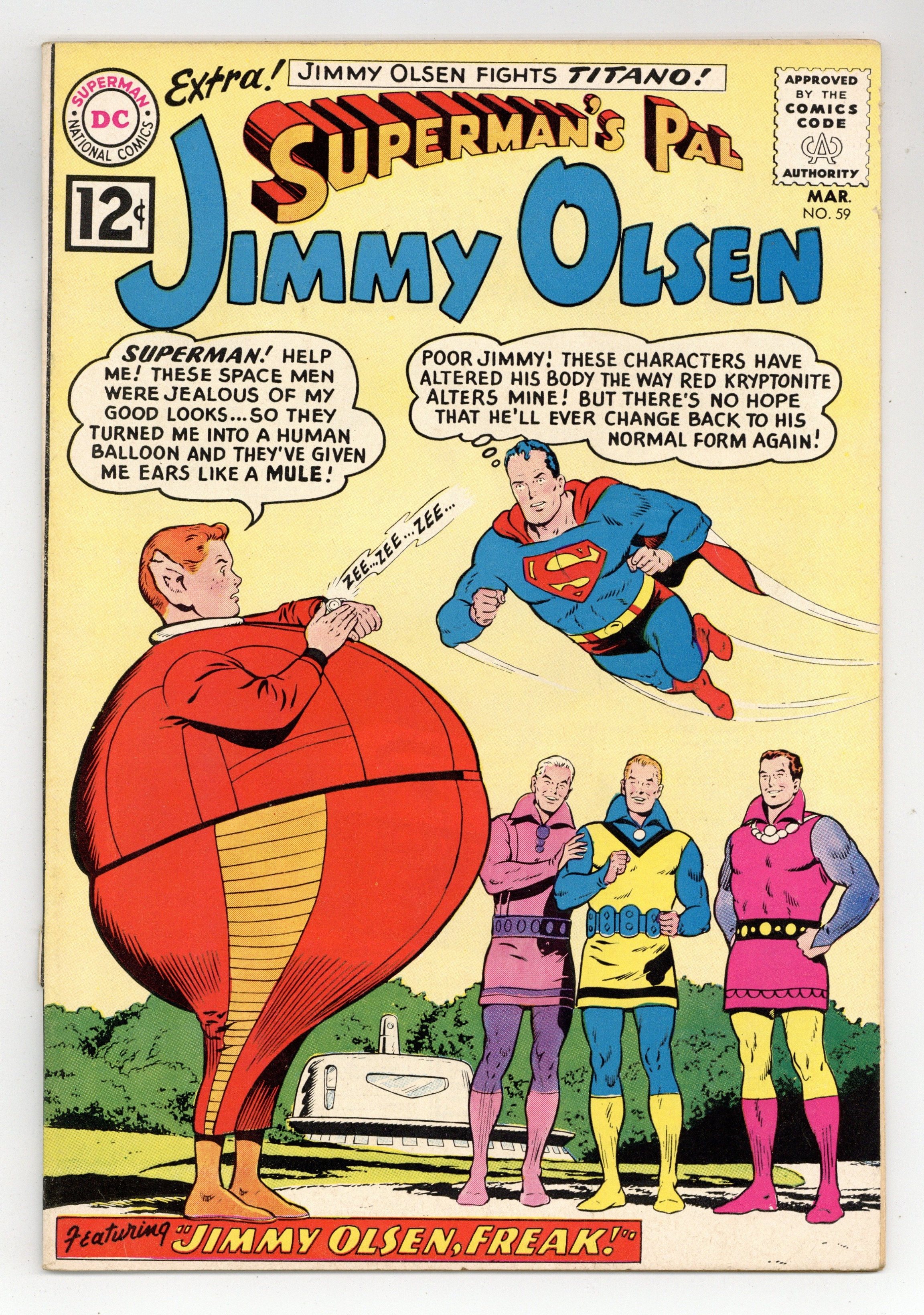 Cover pencils by Curt Swan, inks by George Klein. Stranded in Evolution Valley!, script by Jerry Siegel, art by John Forte; Jimmy and a robot get stuck in evolution valley, which has dinosaurs, a cavewoman, and Titano. Little Pete humor page by Henry Boltinoff. Jimmy Olsen in Scotland Yard!, script by Leo Dorfman, pencils by Curt Swan, inks by George Klein; Perry sends Jimmy to England to work for Scotland Yard for a week; While there Jimmy tries to capture the Purple Pimpernel. Jimmy Olsen, Freak!, script by Leo Dorfman, pencils by Curt Swan, inks by George Klein. Statement of ownership--average paid circulation 520,000. 36 Pages, Full Color. Cover price $0.12.