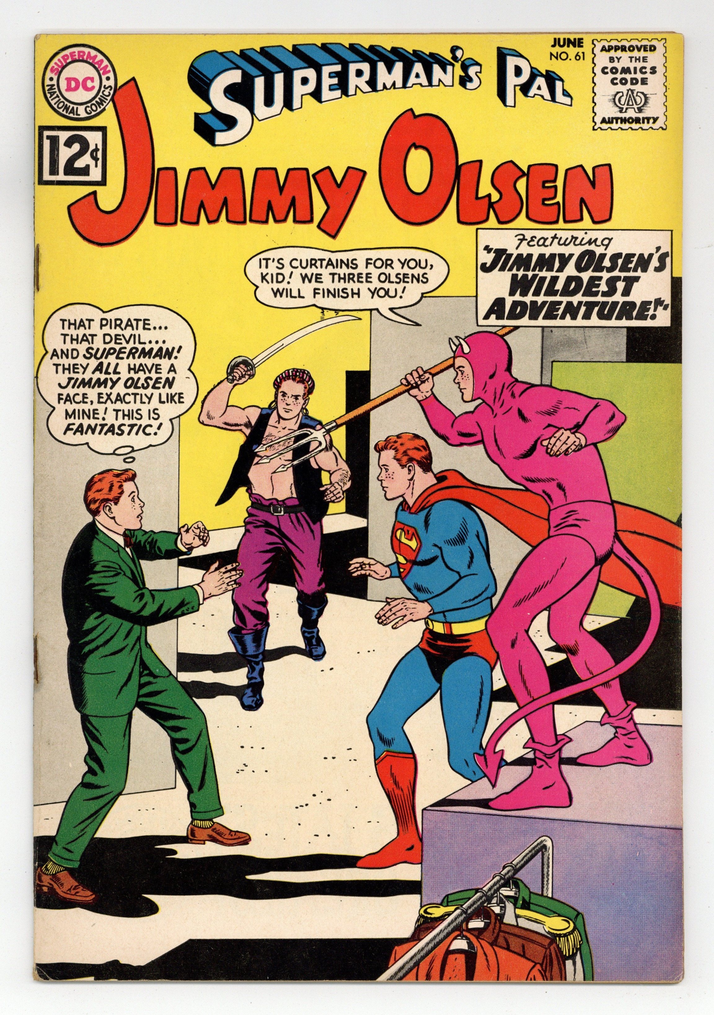 Cover pencils by Curt Swan, inks by George Klein. Jimmy Olsen, Coward!, script by Leo Dorfman, pencils by Curt Swan, inks by George Klein; Professor Potter's invention supposedly transfers Clark Kent's timid personality into Jimmy. Your Pass to New Worlds! public service announcement about libraries, script by Jack Schiff, art by Sheldon Moldoff. Olsen the Roughneck!, script by Robert Bernstein, art by John Forte; Lucy thinks that Jimmy thinks she wants to be slapped around. Varsity Vic humor page by Henry Boltinoff. Jimmy Olsen's Wildest Adventure!, script by Bill Finger, art by John Forte. 36 Pages, Full Color. Cover price $0.12.
