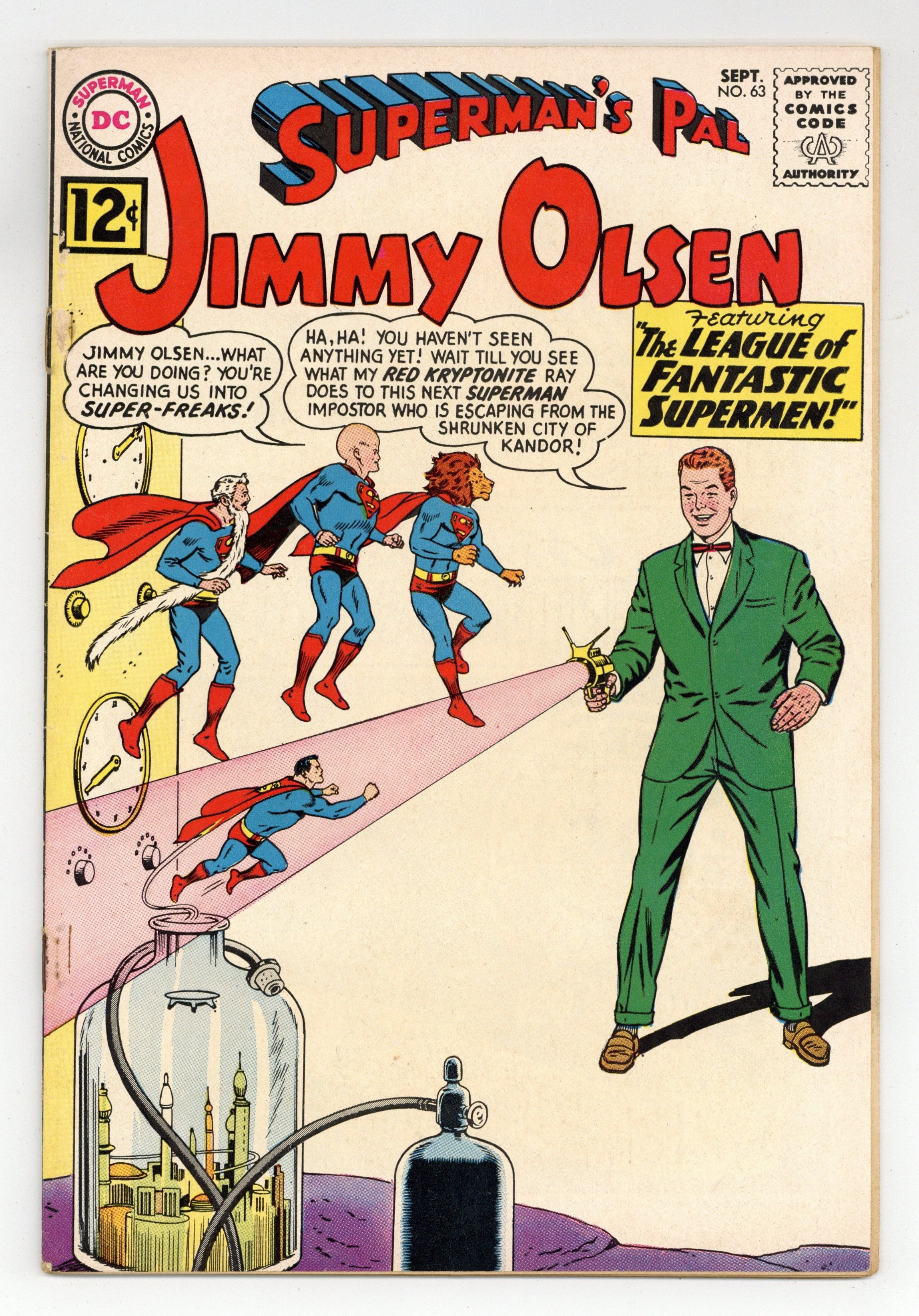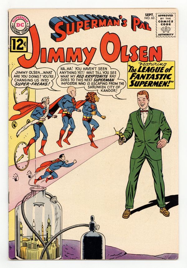 Cover pencils by Curt Swan, inks by George Klein. The League of Fantastic Supermen, script by Jerry Siegel, pencils by Curt Swan, inks by George Klein; Four Kandorian criminals escape from the bottle city and plan to go on a rampage. Jimmy Olsen, Editor-In-Chief!, script by Leo Dorfman, pencils by Curt Swan, inks by George Klein; Jimmy and Perry White switch roles. The Tom Thumb Jimmy Olsen!, art by John Forte. 36 Pages, Full Color. Cover price $0.12.