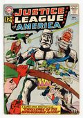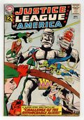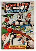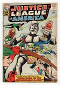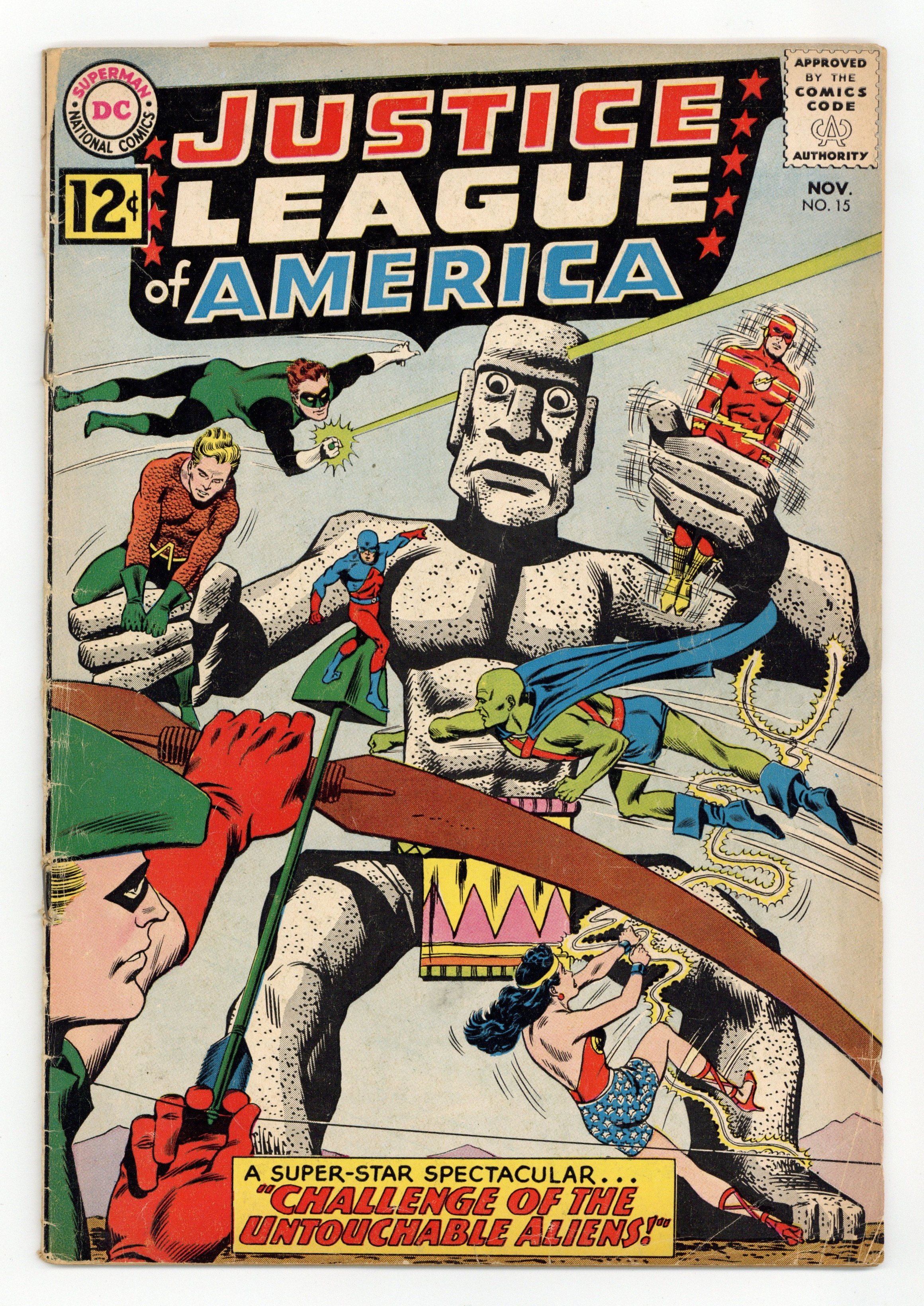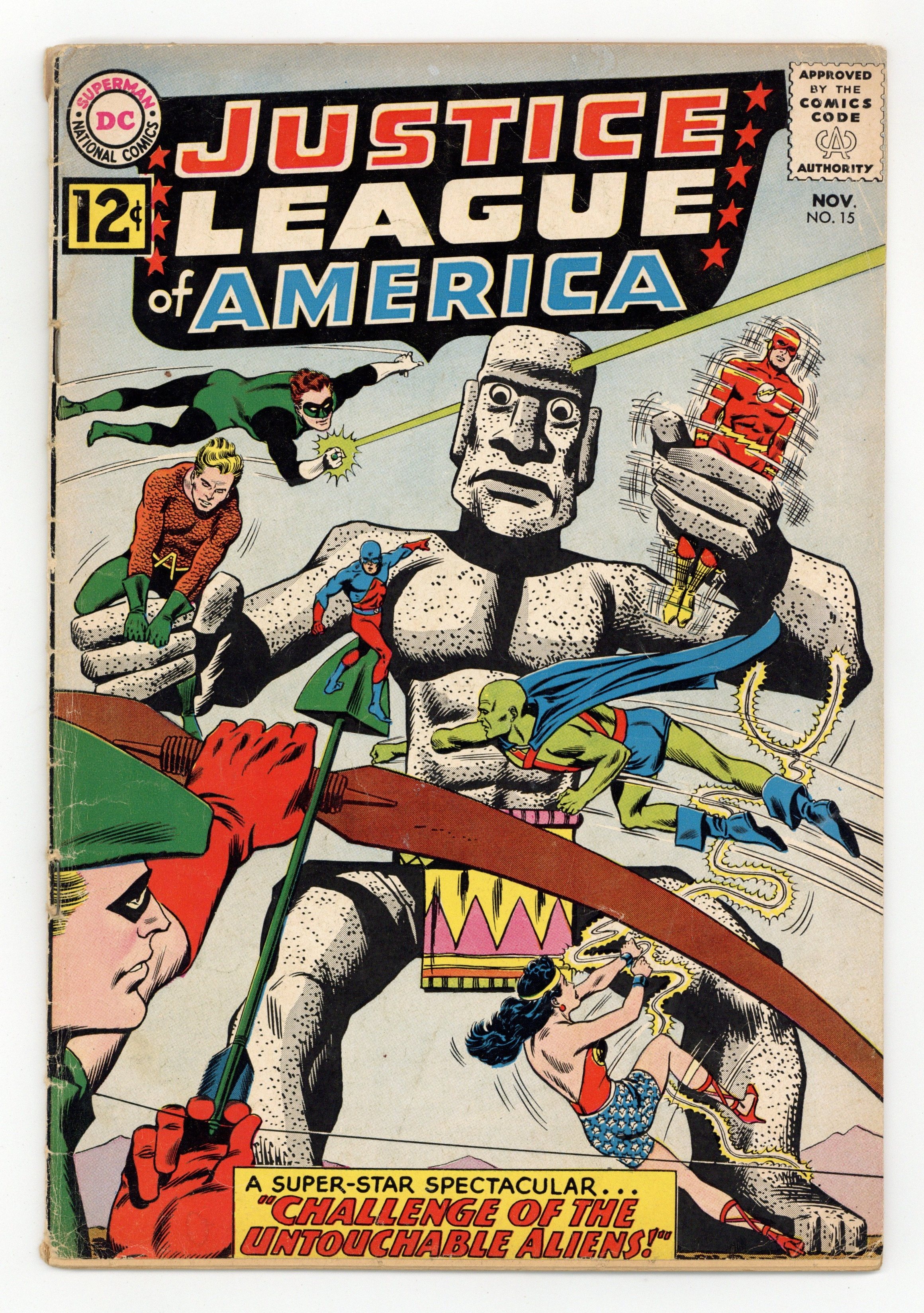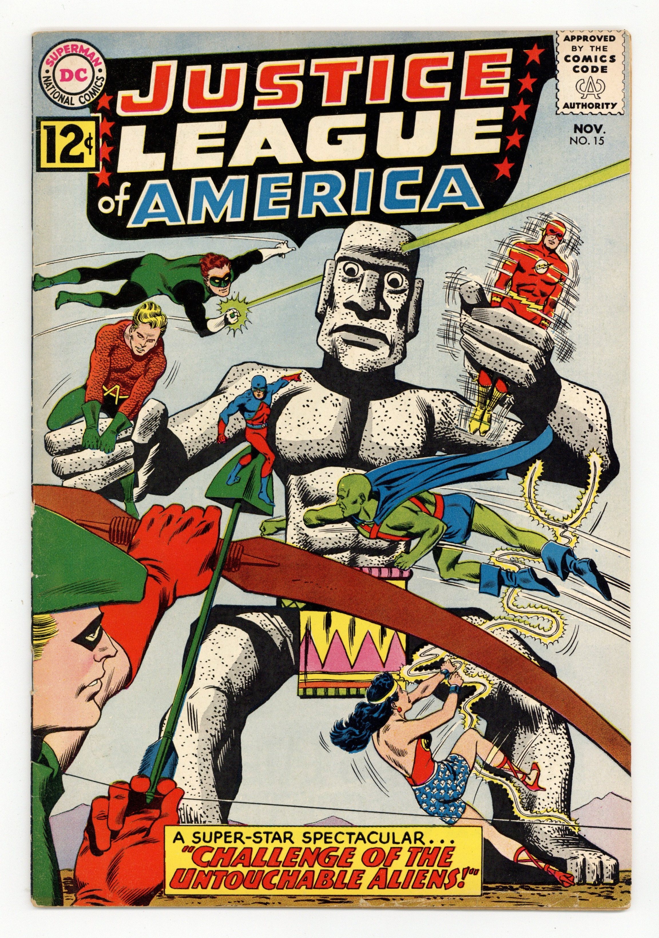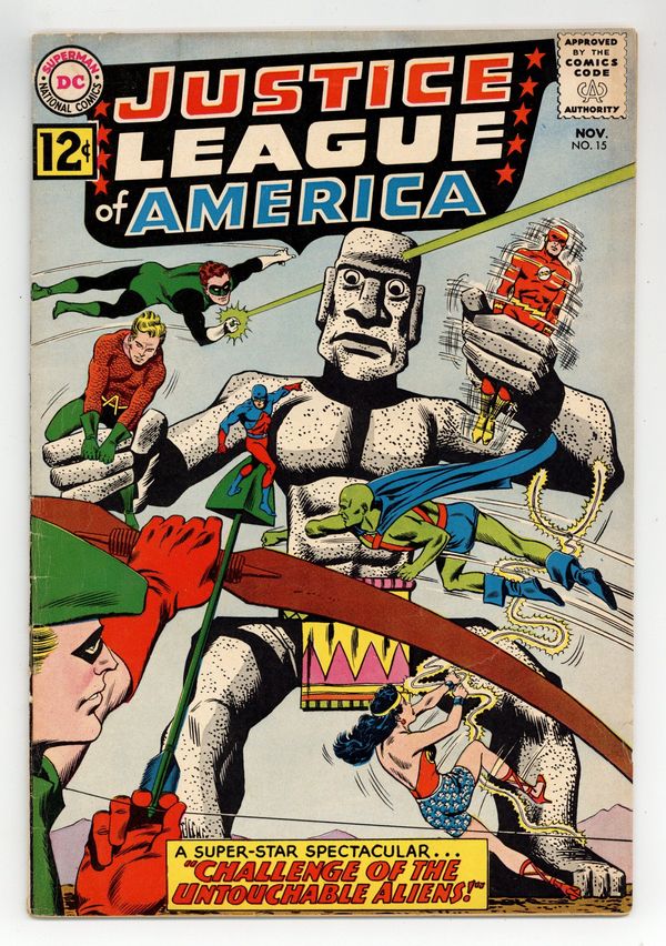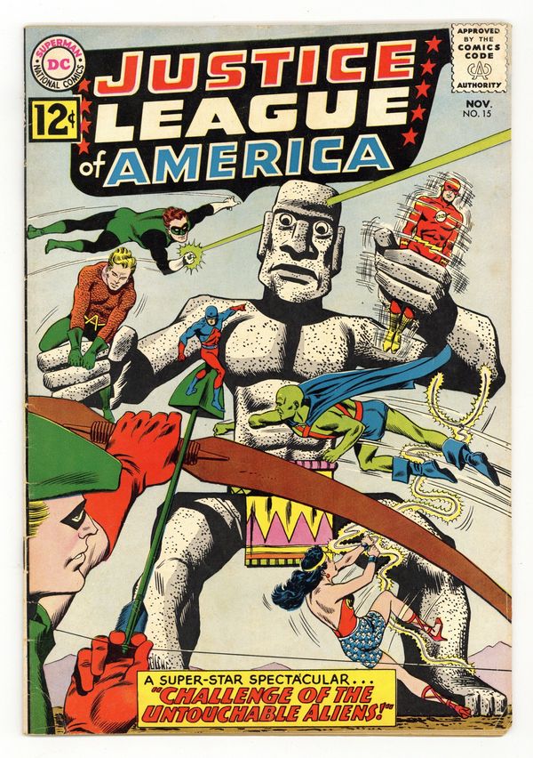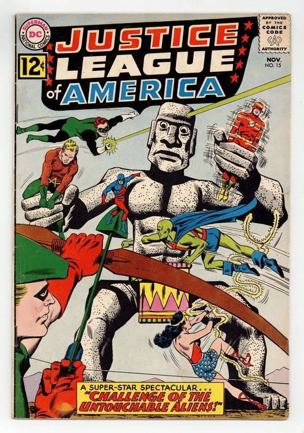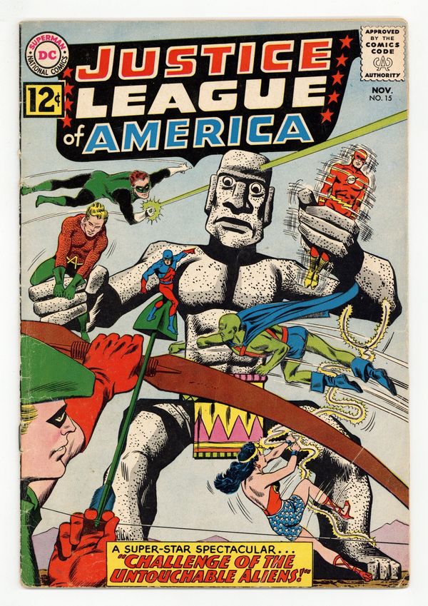 Cover pencils by Mike Sekowsky, inks by Murphy Anderson. The Challenge of the Untouchable Aliens!, script by Gardner Fox, pencils by Mike Sekowsky, inks by Bernard Sachs; Superman and Wonder Woman save the Satellite Sky Fortress, and The Flash sees its cannon aiming at a skyscraper in Central City. Superman and Wonder Woman destroy it, and they summon the Justice League; Searching the world, they find stone giants that can't be touched. Our Strange Universe article. 36 pgs. $0.12. Cover price $0.12.