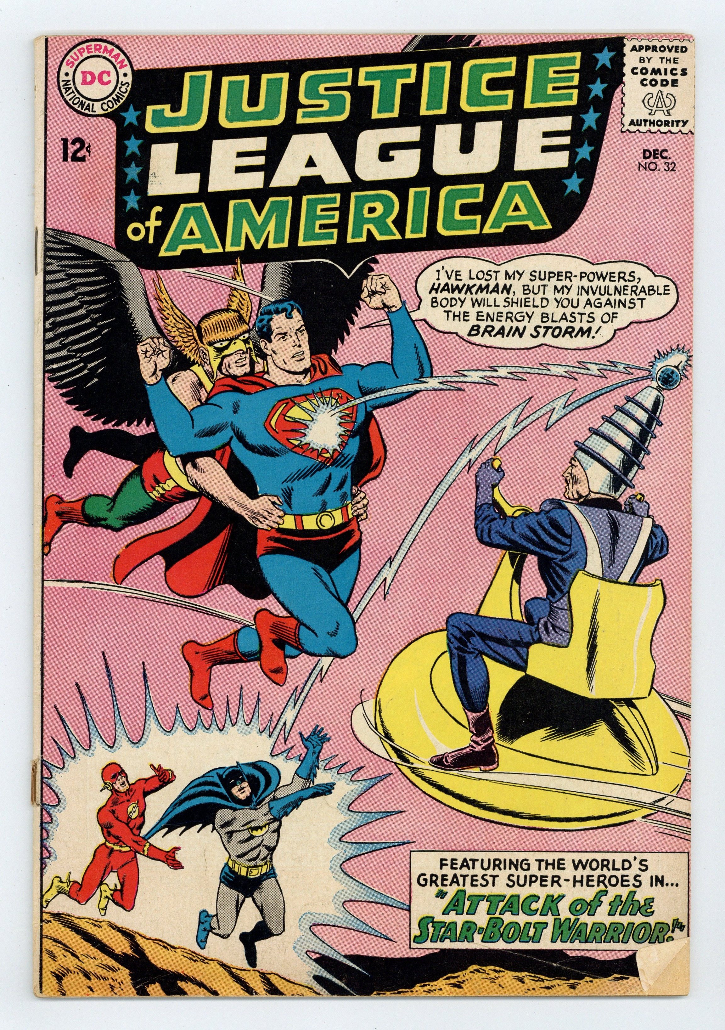 $16.00Cover pencils by Mike Sekowsky, inks by Murphy Anderson. Attack of the Star-Bolt Warrior!, script by Gardner Fox, pencils by Mike Sekowsky, inks by Bernard Sachs; Brain Storm gathers the JLA as witnesses to his execution of Green Lantern for the murder of his brother. 36 pgs. $0.12. Cover price $0.12.