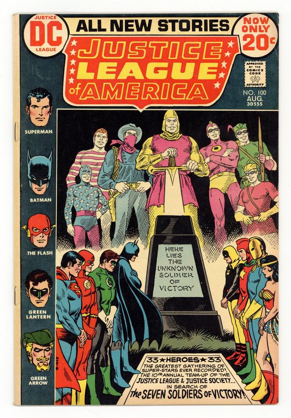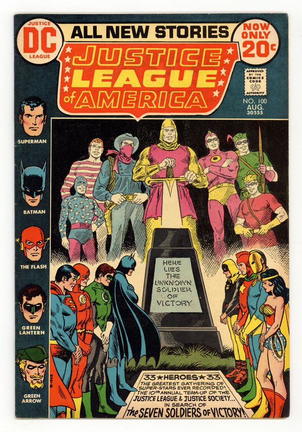1st meeting of Golden Age and Silver Age Wonder Woman. Cover art by Nick Cardy. The Unknown Soldier of Victory!, script by Len Wein, pencils by Dick Dillin, inks by Joe Giella; A new menace looms once again vs. the JLA and JSA during the middle of their annual celebration, as they face off vs. a menace that almost destroyed the Seven Soldiers of Victory: The Hand; The two groups split up into smaller teams as they try to solve the mystery of the lost Seventh Soldier in battle; A mysterious presence known as the Oracle aids them in their quest as they try to reunite the Seven Soldiers, scattered throughout time on Earth-2. 36 pgs. $0.20. Cover price $0.20.