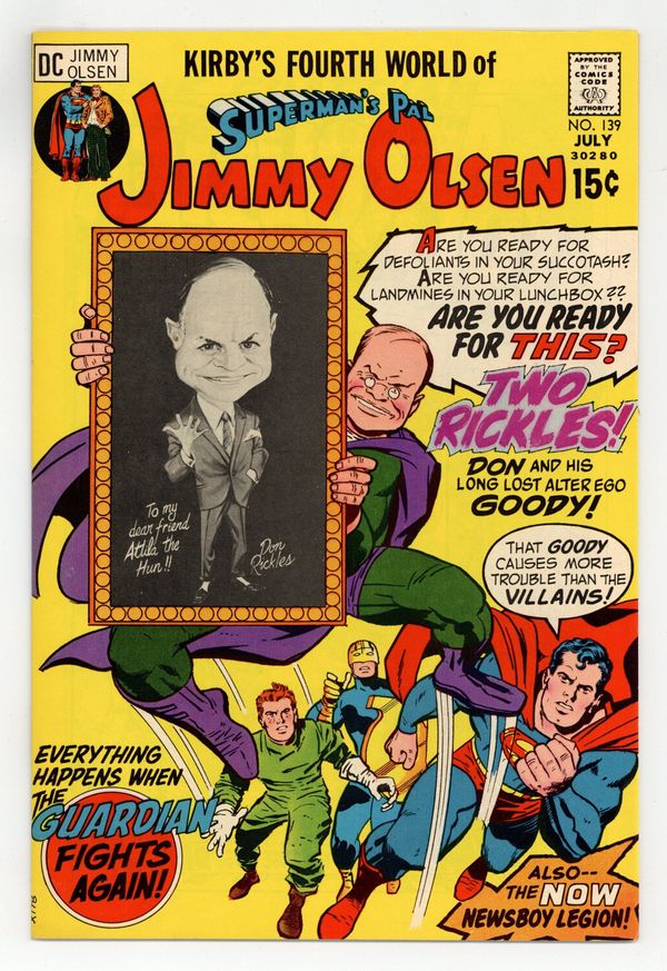 Partial photo cover. Cover pencils by Jack Kirby and Murphy Anderson (Superman and Jimmy Olsen heads), inks by Vince Colletta. The Guardian Fights Again!!!, script by Jack Kirby, pencils by Jack Kirby and Murphy Anderson (Superman and Jimmy Olsen heads), inks by Vince Colletta; Morgan Edge's latest scheme involves Don Rickles look-alike Goody Rickles, a UFO that traps Superman as Clark Kent and sends him into space, and an Inter-Gang kidnapping plot involving Jimmy Olsen, Guardian, and the Newsboy Legion. Letter to the editor from writer Steven Utley. 36 Pages, Full Color. Cover price $0.15.