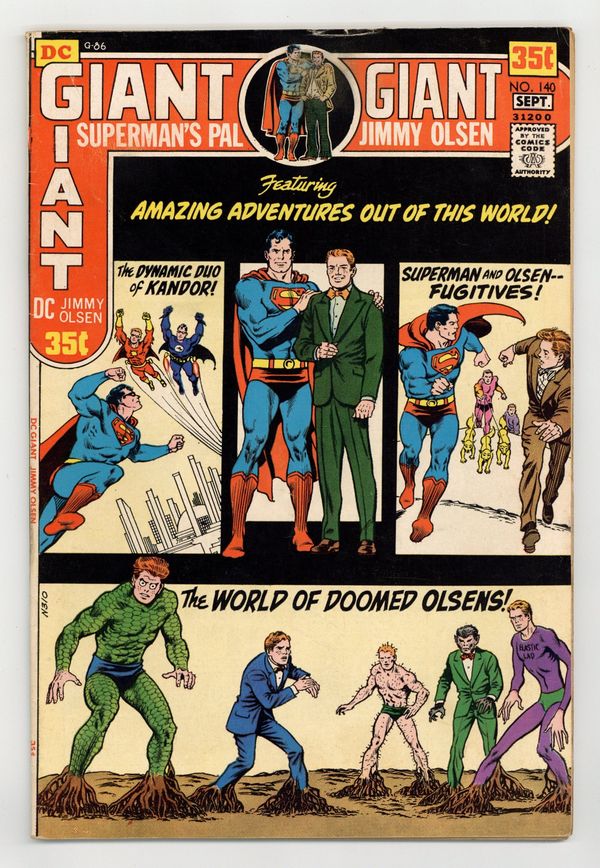 Giant-size issue. Cover pencils by Curt Swan, inks by Murphy Anderson. Invasion of the Mystery Super-Men! [Superman in Kandor part 1], script by Edmond Hamilton, pencils by Curt Swan, inks by George Klein; Superman and Jimmy Olsen travel to Kandor to discover how normal sized Kandorians are on Earth and why they are attacking Superman. The Dynamic Duo of Kandor! [Superman in Kandor part 2]; Superman and Jimmy Olsen take the secret identites of Nightwing and Flamebird so they can track down Than-Ol's raiders and stop his scheme to enlarge Kandor. The City of Super-People! [Superman in Kandor part 3]; Than Ol succeeds in enlarging Kandor, but Superman must re-shrink it before Than-Ol's process destroys it completely. The Caped Crimefighers of Kandor!, script by Edmond Hamilton, pencils by Curt Swan, inks by George Klein. The Super-Showdown in Kandor! [The Caped Crimefighters of Kandor! part two]. The World of Doomed Olsens!, script by Jerry Siegel, pencils by Curt Swan, inks by George Klein. 68 Pages, Full Color. Cover price $0.35.