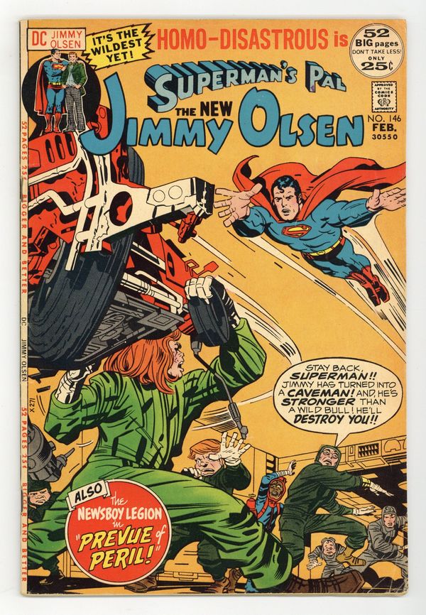 Cover pencils by Jack Kirby, inks by Mike Royer. Homo-Disastrous!, script and pencils by Jack Kirby, inks by Mike Royer; the Newsboy legion battles a primitive Jimmy Olsen; Superman Dubbilex, Terry Dean, and the Golden Guardian check out a tunnel that leads to the DNA Project. Arin the Armored Man!!!--Tales of the DNA Project, script and pencils by Jack Kirby, inks by Mike Royer. Prevue of Peril starring the Newsboy Legion, script by Jack Kirby and Joe Simon, pencils by Jack Kirby, inks by Joe Simon. 52 Pages, Full Color. Cover price $0.25.
