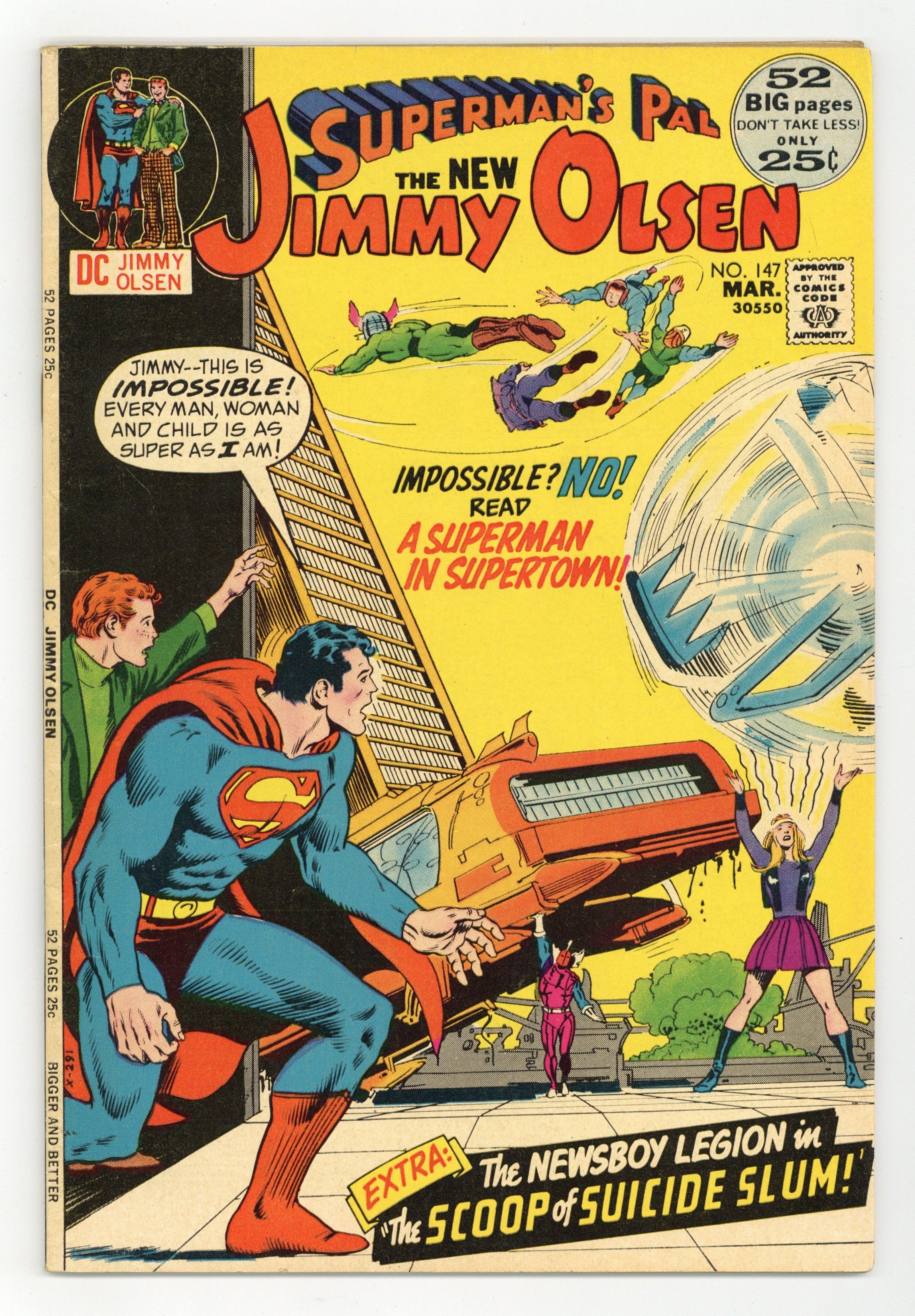 Ends Dec 8 9:36 PM CST Bid History 8 bids Current Bid $13 Your Secret Max Bid If you'd like to bid, please log in or register. Cover pencils by Neal Adams, inks by Murphy Anderson. A Superman in Super-Town!, script and pencils by Jack Kirby, inks by Mike Royer; Superman visits New Genesis and meets Magnar and Highfather; he returns to Earth to help Jimmy and the Newsboy Legion, who are prisoners of evil Victor Volcanium. The Scoop of Suicide Slum starring the Newsboy Legion, script by Jack Kirby; Joe Simon, pencils by Jack Kirby, inks by Joe Simon. Letter to the editor from comics writer Bob Rozakis. Statement of ownership--average print run 555,000; average paid circulation 299,882. 52 Pages, Full Color. Cover price $0.25.