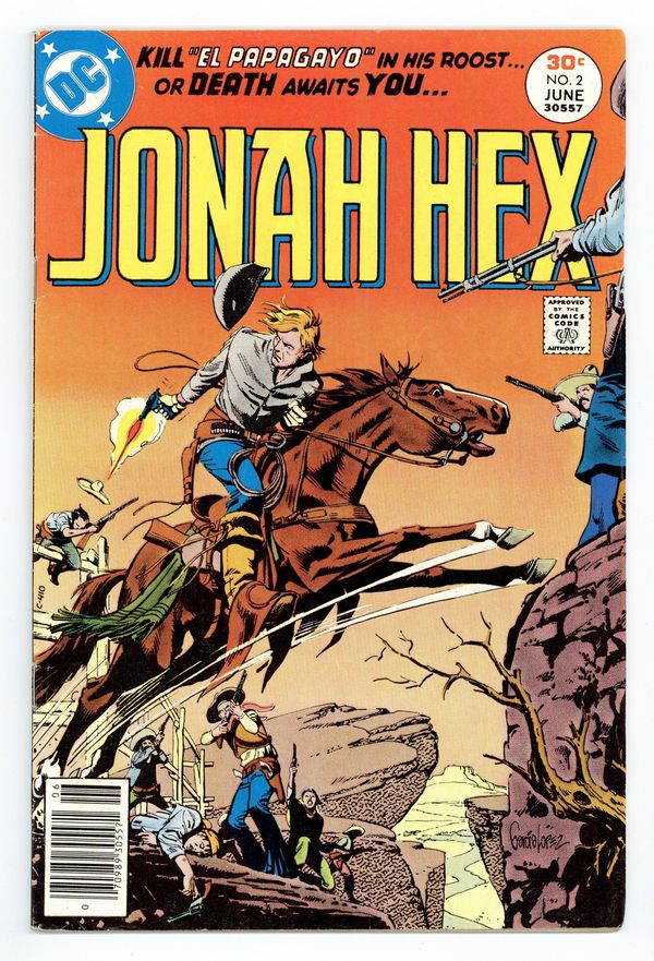 Mr. Turnbull has Jonah framed for murder in "The Lair of the Parrot!" Characters: Jonah Hex; El Papagayo (introduction and first appearance); Mr. Turnbull. Written by Michael Fleisher, with art and cover by Jose Luis Garcia-Lopez. Cover price $0.30.