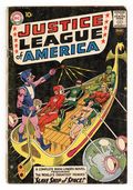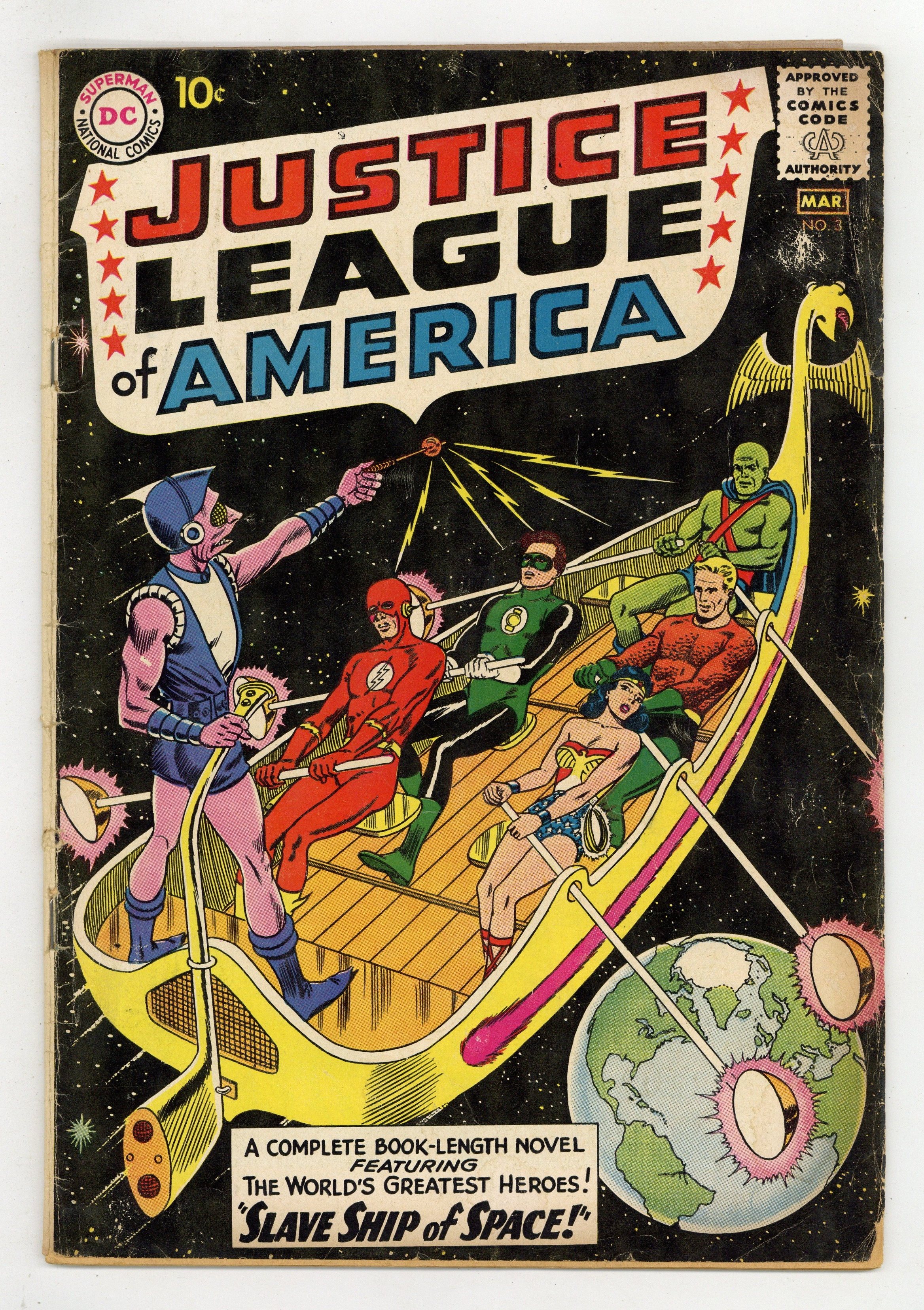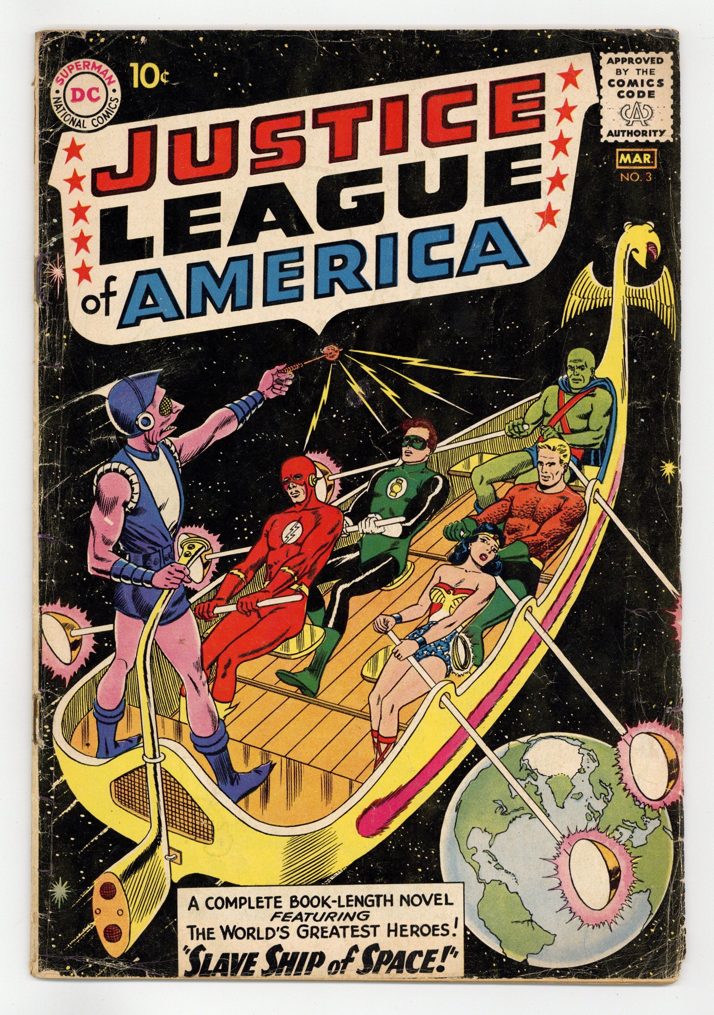 Cover art by Murphy Anderson. The Slave Ship of Space!, script by Gardner Fox, pencils by Mike Sekowsky, inks by Bernard Sachs; Kanjar Ro forces the Justice League to help him defeat his enemies by freezing the people of Earth motionless. Only the combined voices of his enemies--Kromm, Hyathis, and Sayyar--saying "Kanjar Ro" can release them. 36 pgs. $0.10. Cover price $0.10.