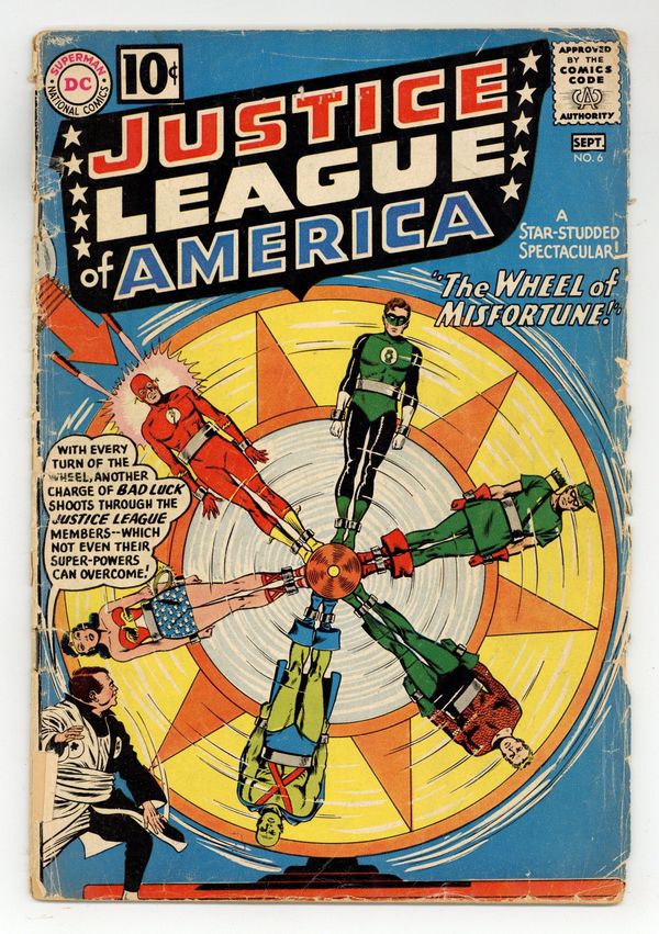 Cover pencils by Mike Sekowsky, inks by Murphy Anderson. The Wheel of Misfortune!, script by Gardner Fox, pencils by Mike Sekowsky, inks by Bernard Sachs; Professor Amos Fortune has found a way to control luck itself with his Stimoluck device, and the Justice League must find a way to overcome his unnaturally good luck while dealing with their own unnaturally bad luck. 36 pgs. $0.10. Cover price $0.10.