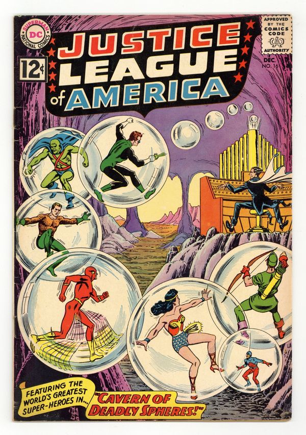 Cover art by Murphy Anderson. Cavern of Deadly Spheres, script by Gardner Fox, pencils by Mike Sekowsky, inks by Bernard Sachs; The Maestro uses mind-control music to orchestrate his crimes and capture the JLA, but he overlooks one tiny thing...the Atom! 36 pgs. $0.12. Cover price $0.12.