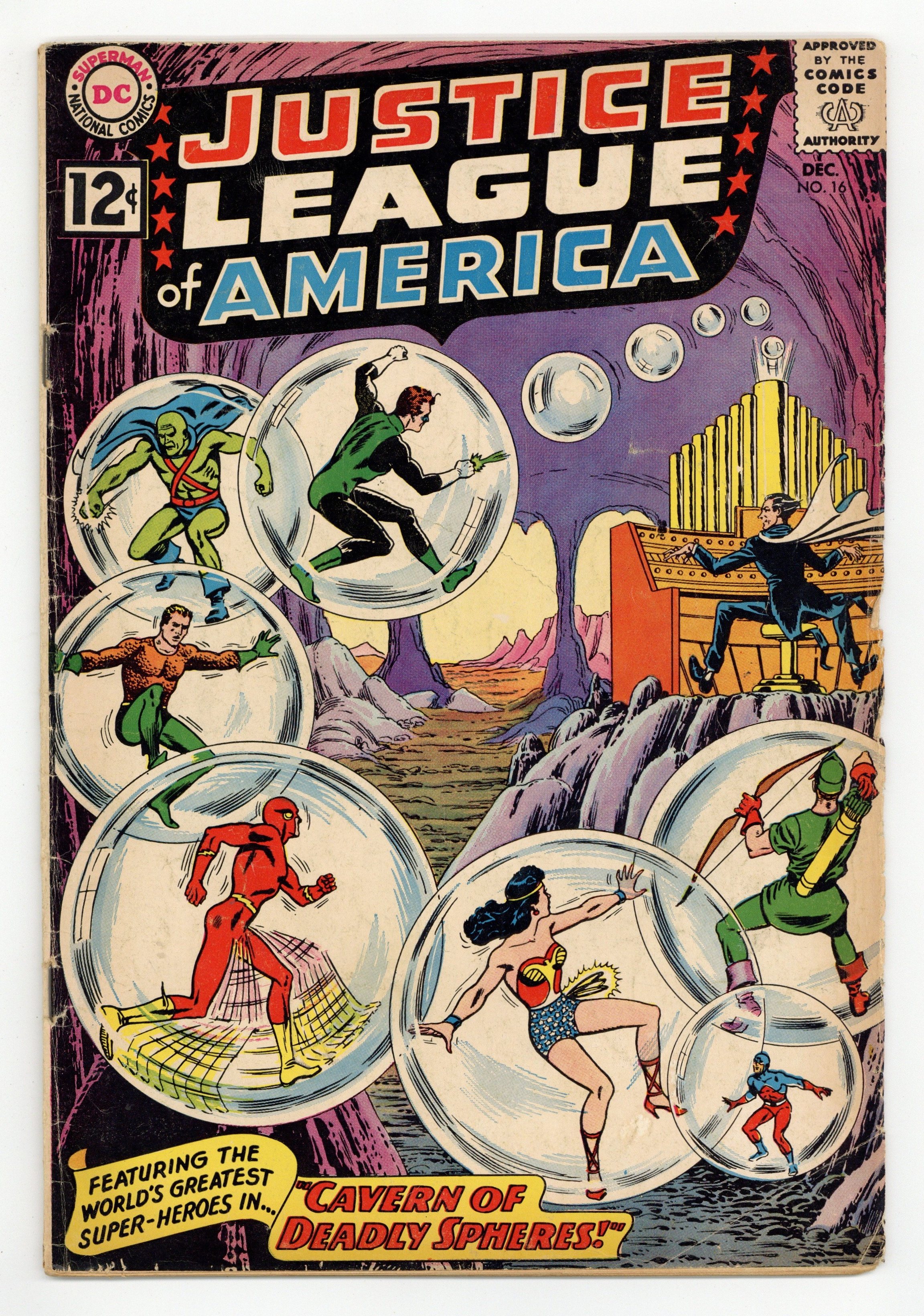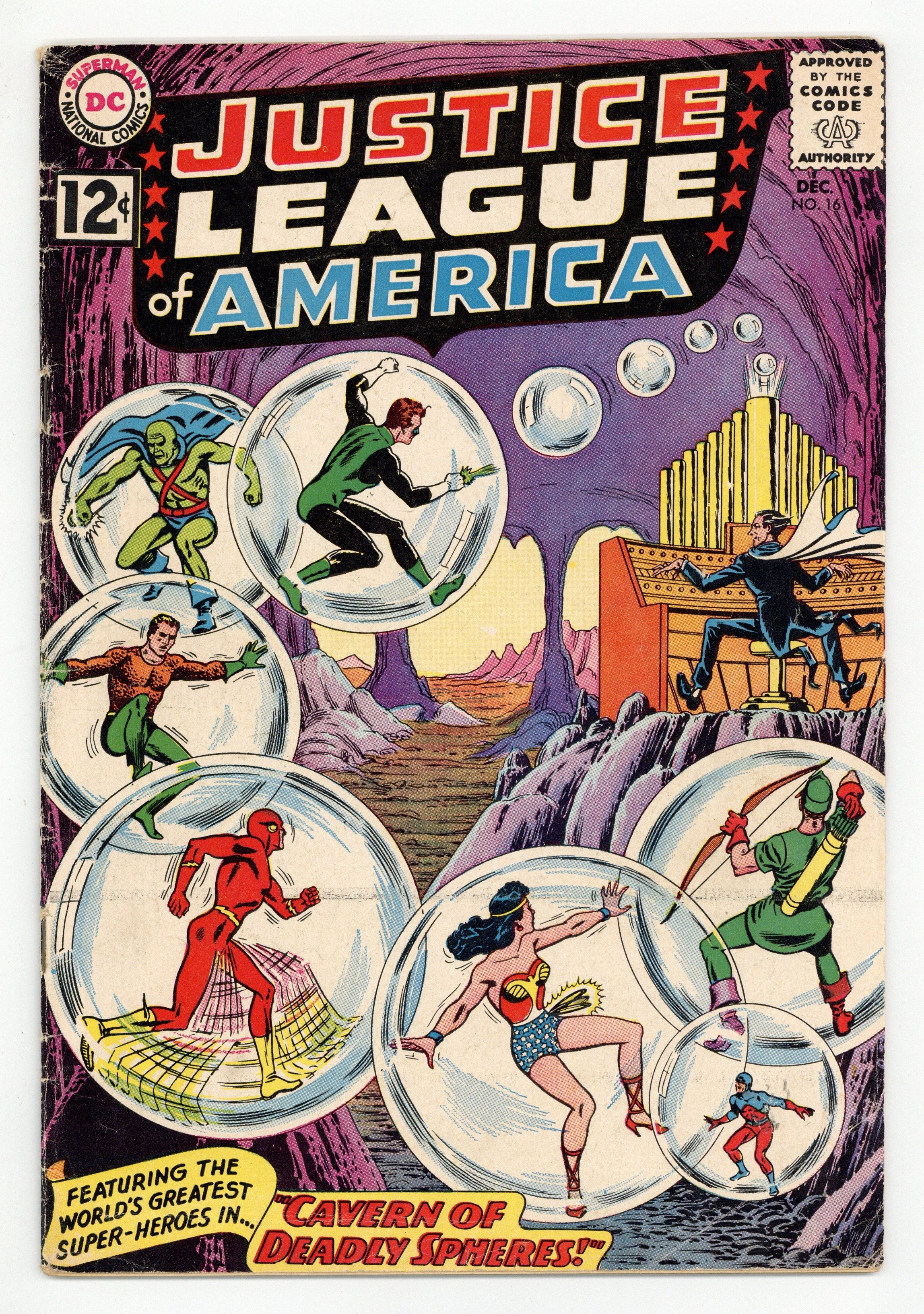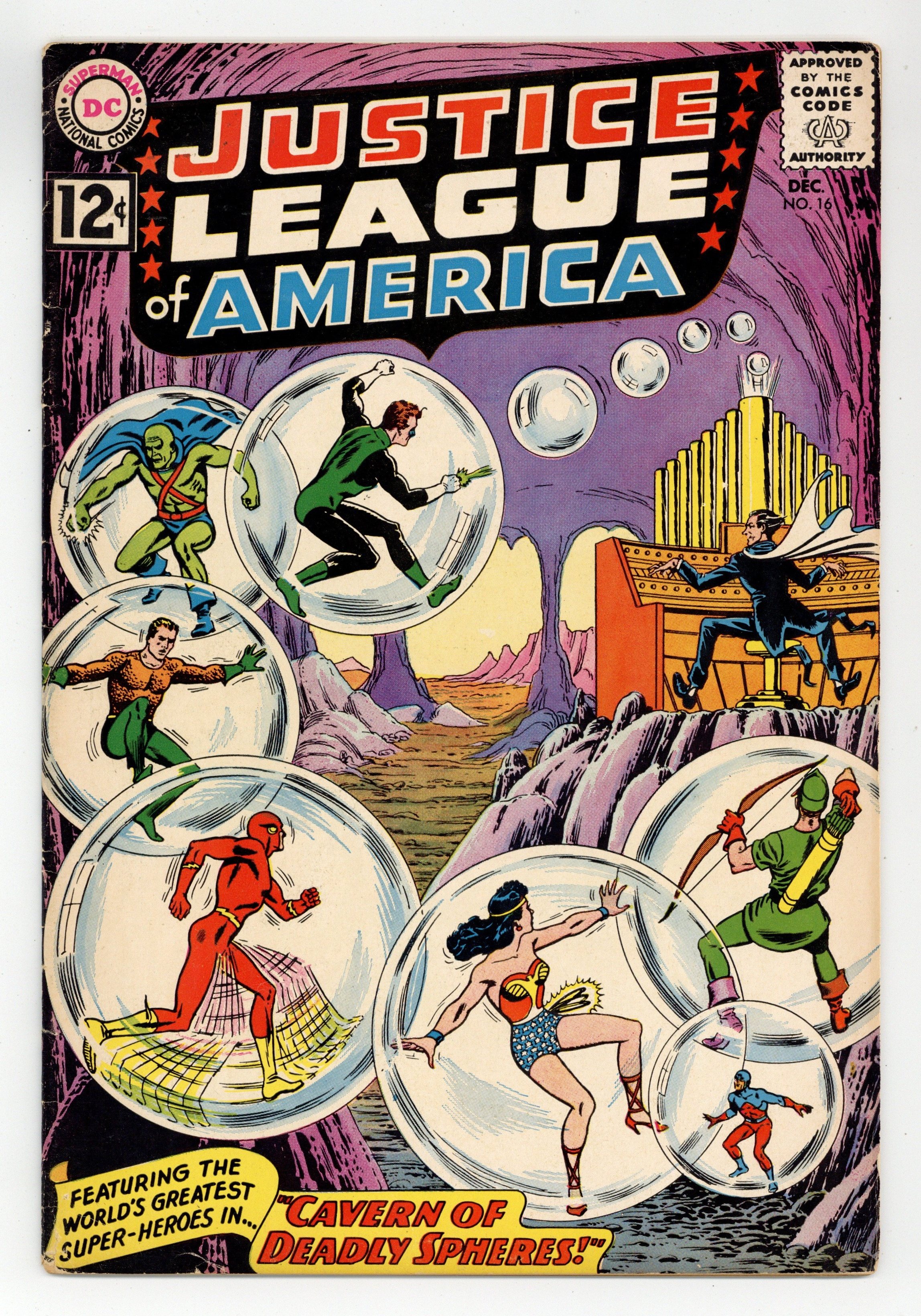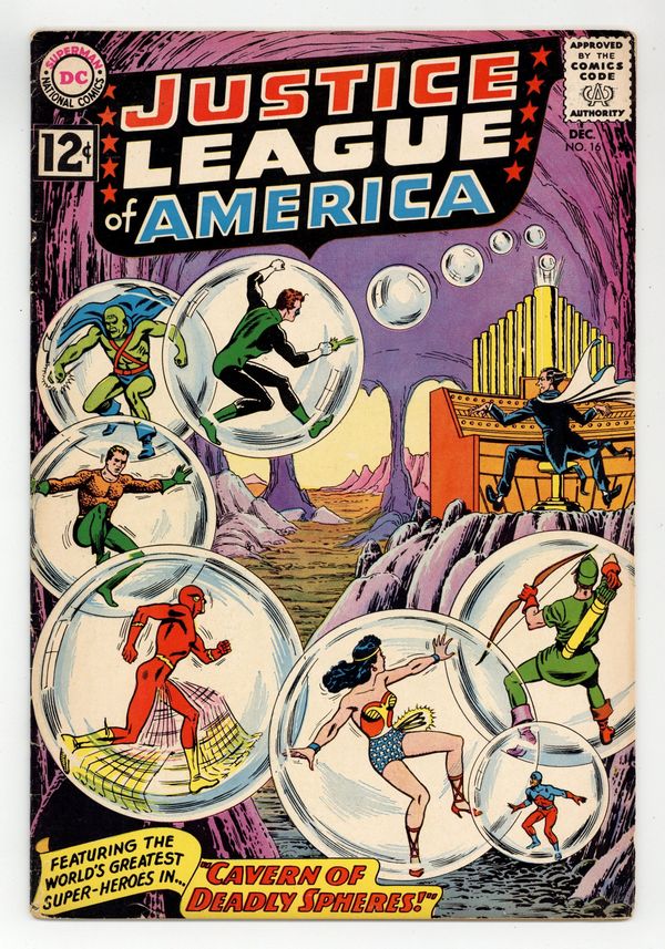 Tags: Justice League/Society$18.50Cover art by Murphy Anderson. Cavern of Deadly Spheres, script by Gardner Fox, pencils by Mike Sekowsky, inks by Bernard Sachs; The Maestro uses mind-control music to orchestrate his crimes and capture the JLA, but he overlooks one tiny thing...the Atom! 36 pgs. $0.12. Cover price $0.12.