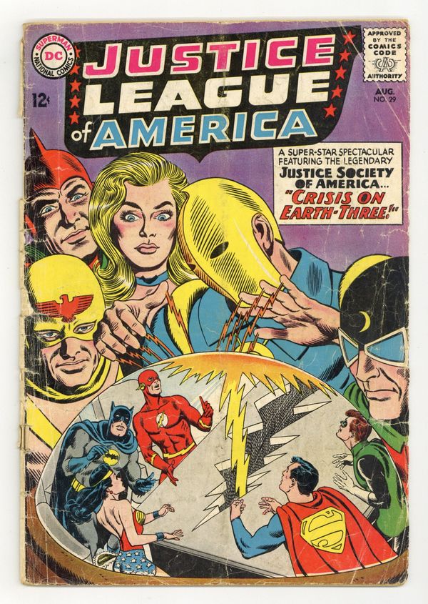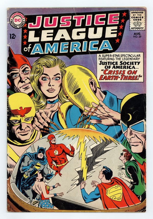 Cover pencils by Mike Sekowsky, inks by Murphy Anderson. Crisis on Earth-Three, script by Gardner Fox, pencils by Mike Sekowsky, inks by Bernard Sachs; The Crime Syndicate is so bored of life on their Earth as supreme villains, designated as Earth-3, that they come to the JLA's Earth for a new challenge after Ultraman accidentally discovers it when exposed to Green Kryptonite (which gives him a new power with every exposure to it); Just as it looks like the JLA has the upper hand, the Crime Syndicate teleports them to Earth-3, where they have the advantage; To secure a level battlefield the Crime Syndicate plans to go to the Earth-2 and eliminate the JSA. 1st Silver Age appearance of Star Man; Justice Society cross-over. Rocky and Bullwinkle star in a one-page Cheerios ad. 36 pgs. $0.12. Cover price $0.12.