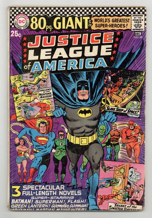 Cover pencils by Mike Sekowsky, inks by Murphy Anderson. Reprints. Challenge of the Weapons Master!, script by Gardner Fox, pencils by Mike Sekowsky, inks by Bernard Sachs; Having found an ancient book that appears to indicate that he once defeated the JLA, Xotar travels from 11,960 to the present to test four weapons against the Justice League, in order to determine which weapon will help him defeat the Intersolar Police of his own day; But the JLA counters each of Xotar's weapons and returns him to face justice in his own time. Secret of the Sinister Sorcerers!, script by Gardner Fox, pencils by Mike Sekowsky, inks by Bernard Sachs. The Slave Ship of Space!, script by Gardner Fox, pencils by Mike Sekowsky, inks by Bernard Sachs. 84 pgs. $0.25. Cover price $0.25.