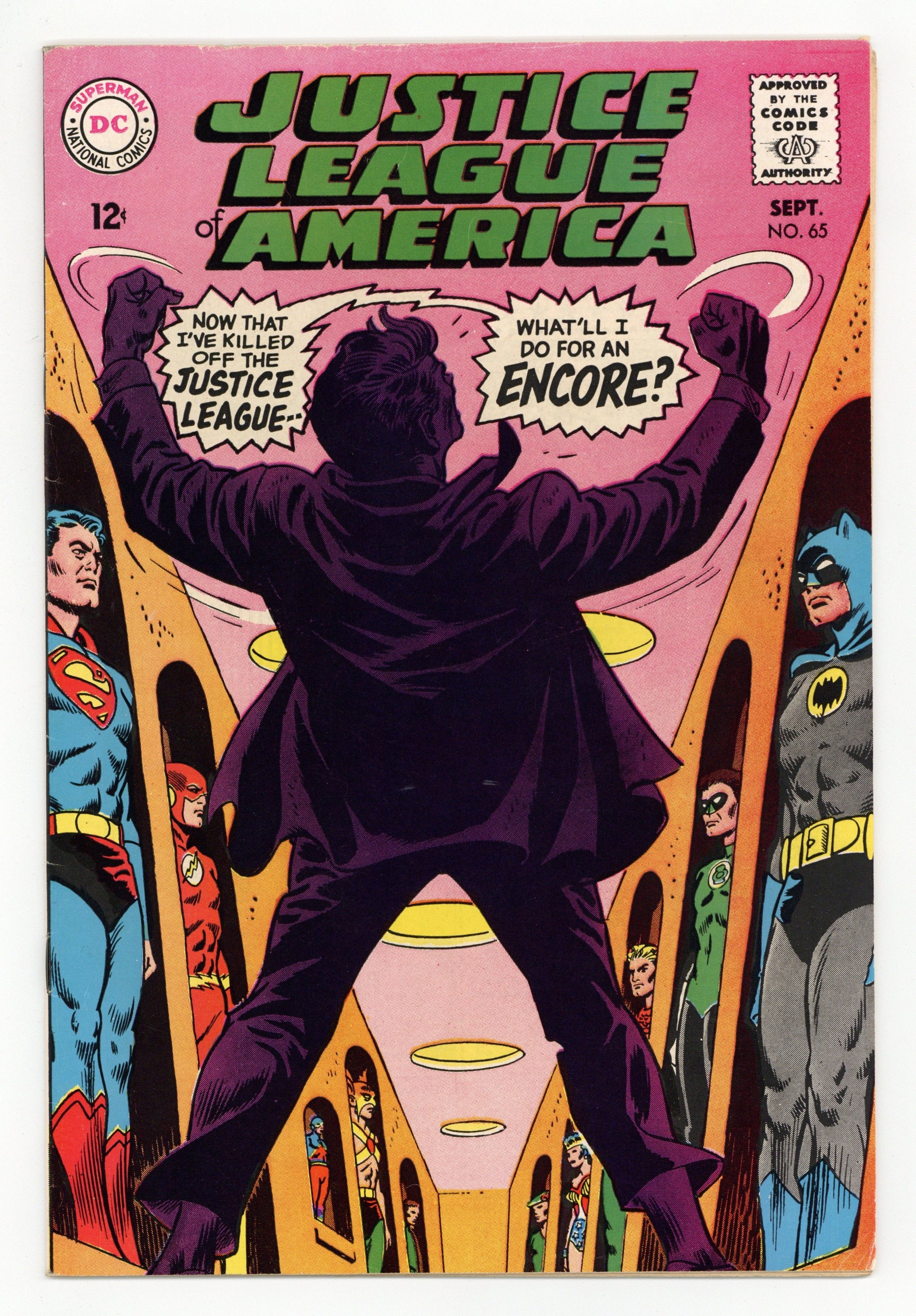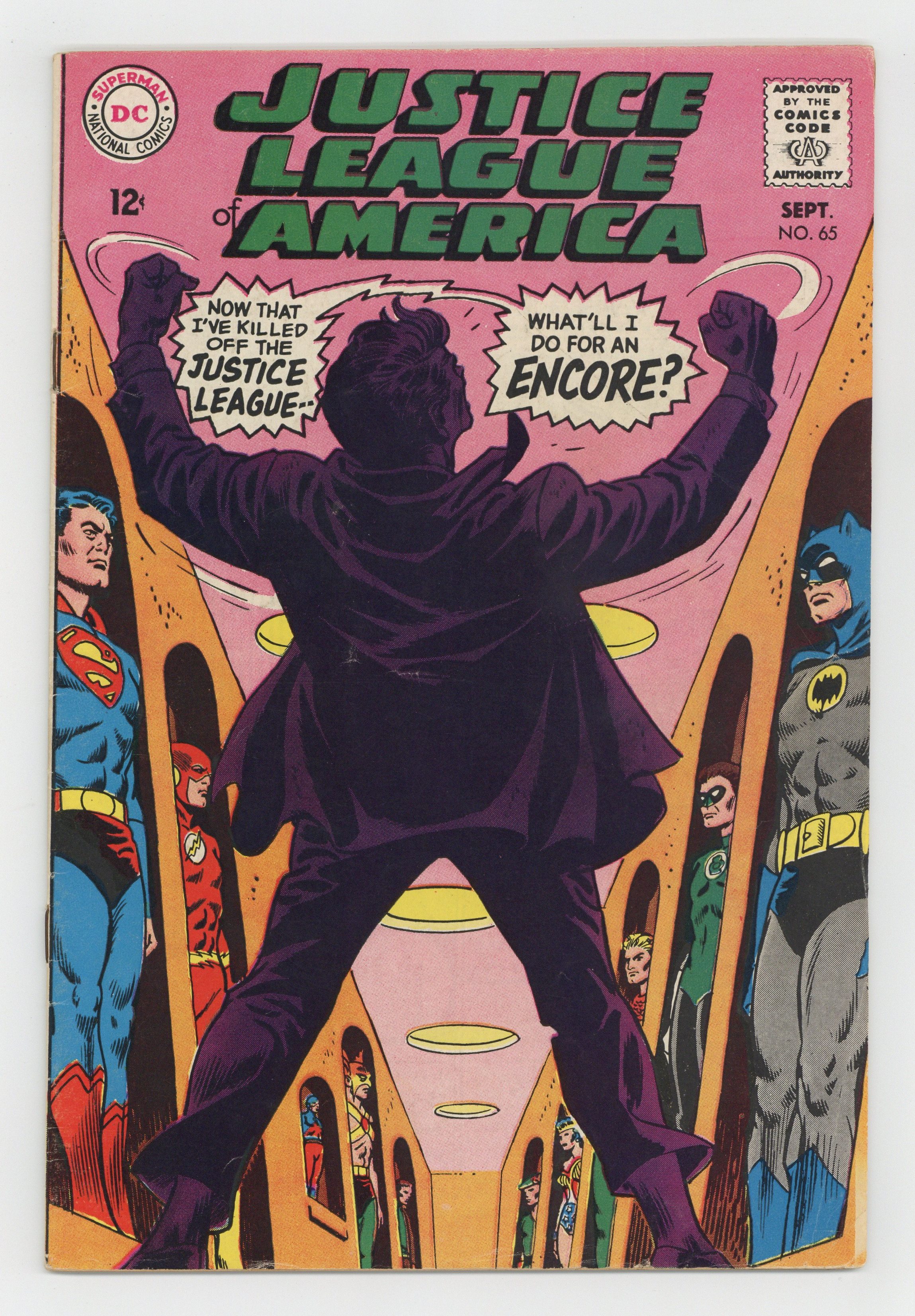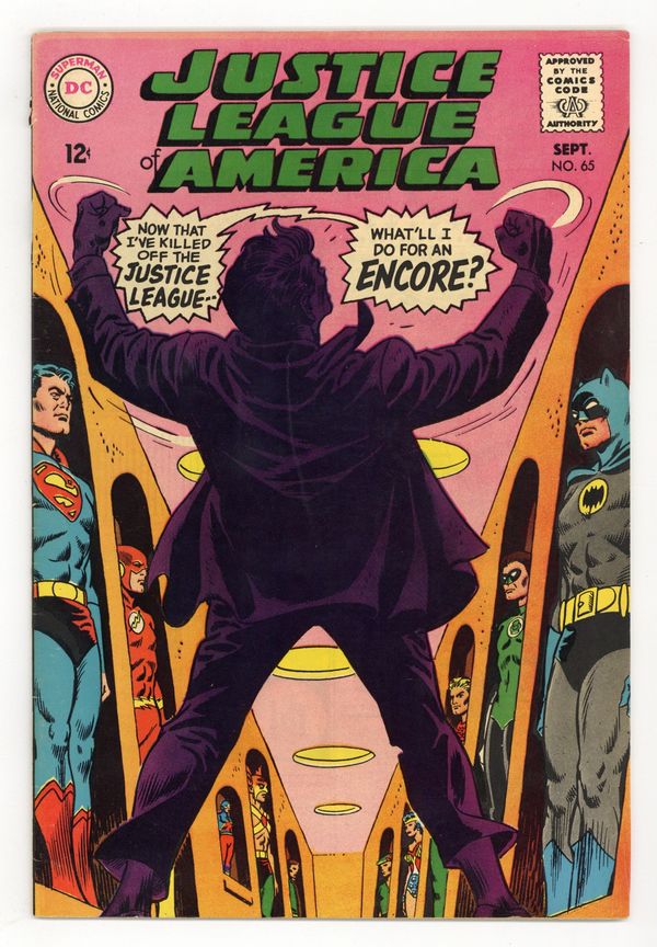 Cover pencils by Dick Dillin, inks by Joe Giella. T. O. Morrow Kills the Justice League -- Today!, script by Gardner Fox, pencils by Dick Dillin, inks by Sid Greene; T. O. Morrow has defeated the JSA on Earth-2 as part of his overall plan; Now he tries to defeat the Justice League in order to stop his latest scheme, which involves his supercomputer stopping all of time itself, which would be fatal to all, since Morrow didn't want that to happen; The revived JLA and JSA teams then defeat Morrow's supercomputer's plot,and Morrow is later jailed. 36 pgs. $0.12. Cover price $0.12.
