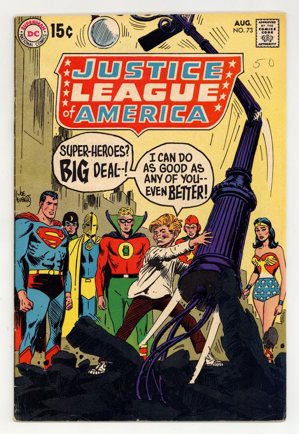 Tags: JLA/JSA Crossovers (part 7.2), Justice League/Society$18.00First 15c cover-priced issue. 1st Silver Age appearance of Golden Age Superman. Cover art by Joe Kubert. Star Light, Star Bright--Death Star I See Tonight!, script by Denny O'Neil, pencils by Dick Dillin, inks by Sid Greene; Starman relays his story to the JSA of a new menace, Aquarius, a stellar being who had been disincorporated after his evil acts, and sensing Starman's Cosmic Rod's energies, steals the rod from him to reincorporate himself; After nearly being defeated by the JSA, Aquarius uses the rod to blink Earth-2 out of existence, but not before several members protect themselves in an energy bubble using Fate's magicks and GL's ring's mystic energies. Red Tornado, meanwhile, has been sent to Earth-1 to the JLA to get help battling Aquarius. First 15c cover-priced issue. 36 pgs. $0.15. Cover price $0.15.