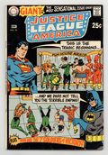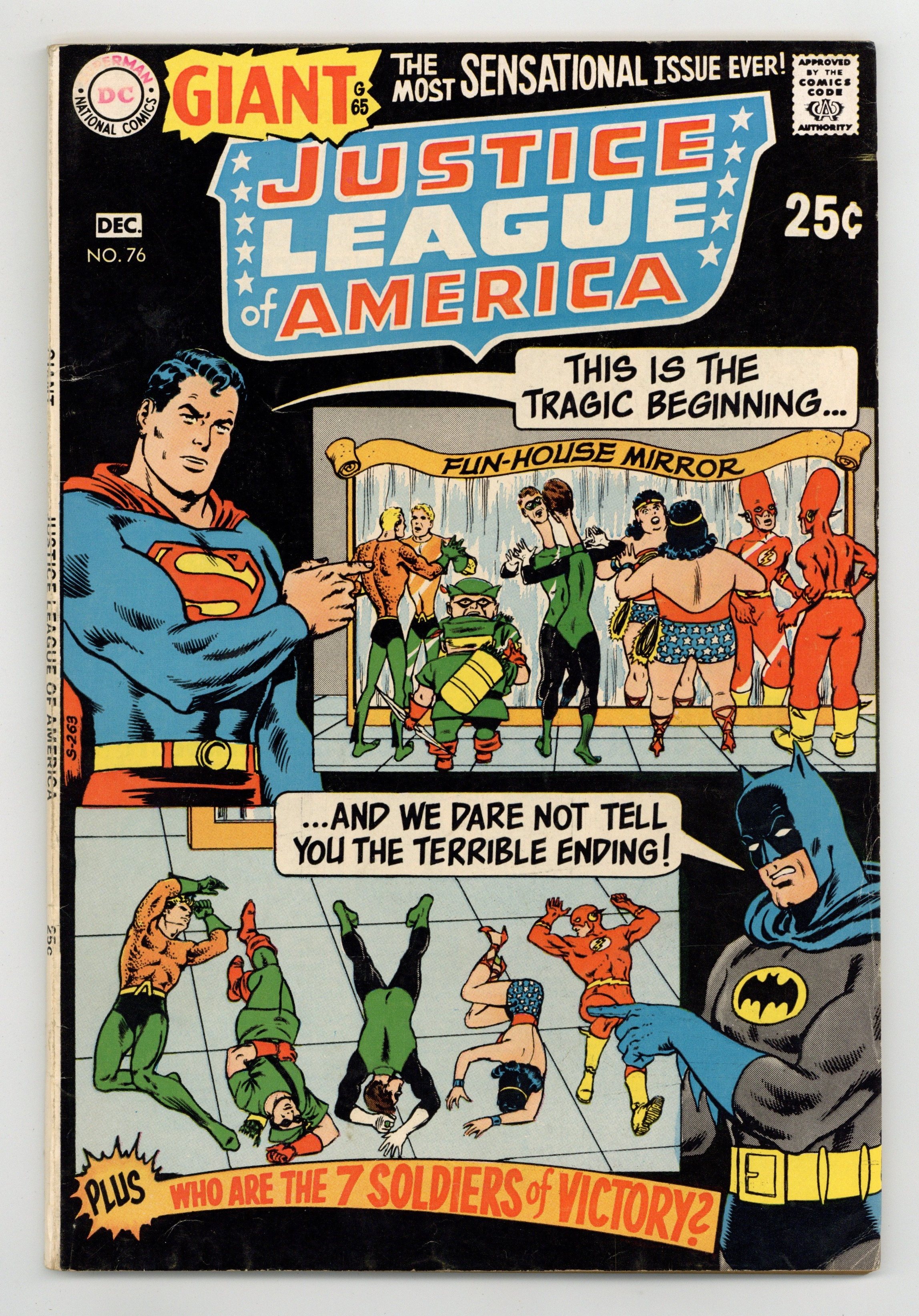 Giant #G-65. This giant-sized issue reprints "The Cosmic Fun-House!" (script by Gardner Fox, pencils by Mike Sekowsky, inks by Bernard Sachs; from JLA # 7) and "The Last Case of the Justice League" (script by Fox, art by Sekowsky/Sachs; from issue 12). Also featured are two team pin-ups with accompanying text histories. One is a beautiful two-page spread drawn by Murphy Anderson featuring the complete roster of the Golden Age Justice Society of America. The second pin-up, a full-pager, features the Seven Soldiers of Victory. Cool stuff! Cover price $0.25.