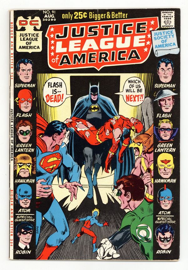 $10.25Cover art by Neal Adams. Earth-- The Monster-Maker!, script by Mike Friedrich, pencils by Dick Dillin, inks by Joe Giella; Three aliens are out on a joyride alongside their symbiotic pets when they lose control of their ship, resulting in one of the aliens being separated from his pet as they travel through the dimensional barrier separating Earths 1 and 2; As the JSA face off vs. the Alien A-Rym, he defeats them, as a result of the adult Robin charging in headstrong. Meanwhile, on Earth-1, as Batman leaves the JLA for another case he's working on, young college-aged Robin faces off alongside the team vs. Teppy, A-Rym's symbiotic pet, with the same actions and consequences; This results in Robin's uniform being torn up. The Day the World Melted featuring Knights of the Galaxy, script by Robert Kanigher, pencils by Carmine Infantino, inks by Joe Giella. The Hour Hourman Died! starring Hourman, script by Gardner Fox, pencils by Dick Dillin, inks by Sid Greene. Letter from editorial director Carmine Infantino on the inflation in the USA and National Publications raising the price of its comics. Harlan Ellison controversy in this issue.52 pgs. $0.25. Cover price $0.25.