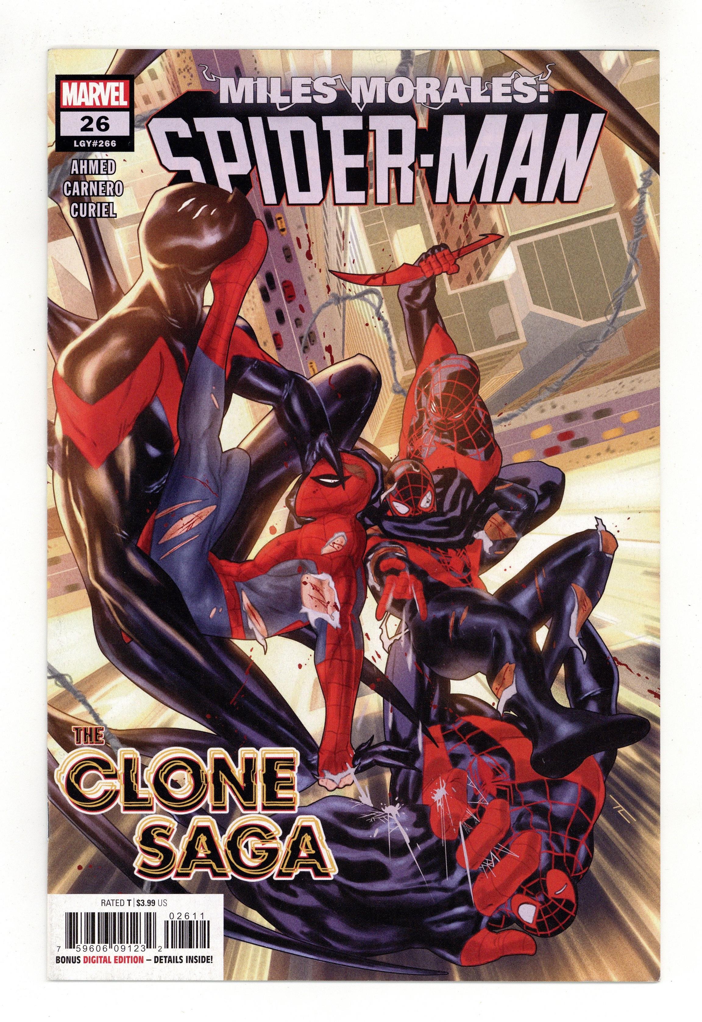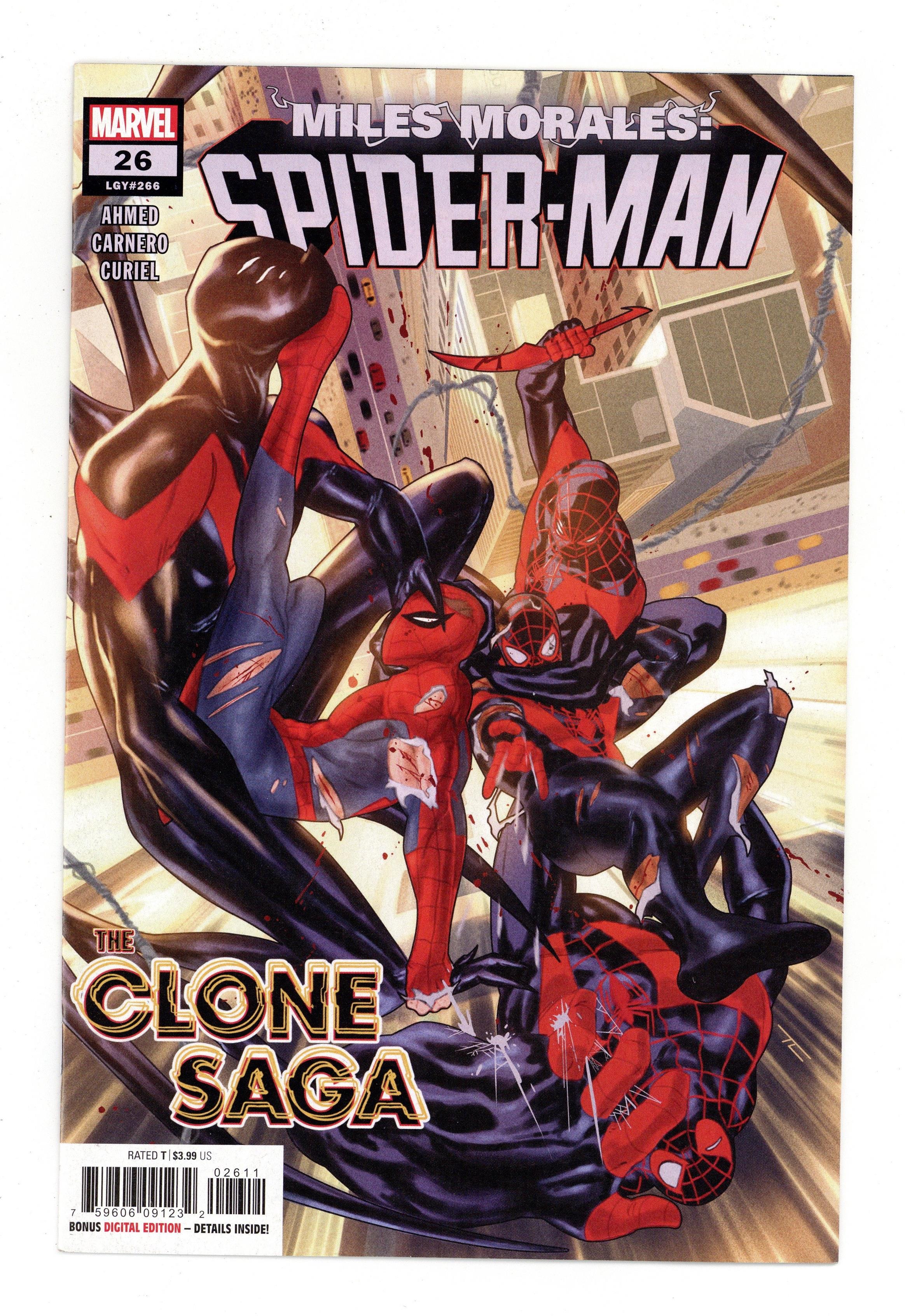 Tags: Marvel Legacy Numbering: Spider-Man (Ultimate) (part 266), Spider-Man$2.70Written by Saladin Ahmed. Art by Carmen Nunez Carnero. Cover by Taurin Clarke. THE CLONE SAGA CONTINUES! Two Spider-Men find themselves face to face with the three terrifying clones. Peter thought he knew what to expect out of a Clone Saga, but this one throws him for a loop and Miles into the deep end of the ocean. Miles tries to keep his Spider-Side away from the rest of his life but this time he's got no say in the matter. 28 pages, full color. Rated T Cover price $3.99.