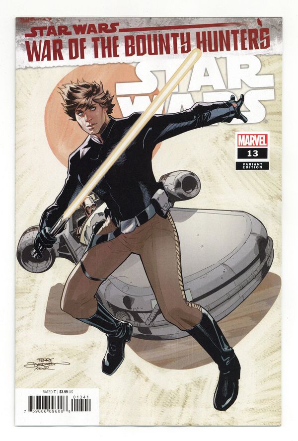 Tags: Star Wars$4.00Limited 1 for 25 Retailer Incentive Variant Cover. Written by Charles Soule. Art by Ramon Rosanas. Cover by Terry Dodson and Rachel Dodson. PRELUDE TO WAR OF THE BOUNTY HUNTERS: 'THE HUNT FOR HAN'. CHEWBACCA has heard from an old friend with intelligence on the location of notorious bounty hunter BOBA FETT, known to be in possession of HAN SOLO. Along with LUKE SKYWALKER, the loyal Wookiee sets off in search of his lost friend, on an adventure to Nar Shadaa... the SMUGGLER'S MOON! But will this mission prevent plucky astromech droid ARTOO DETOO from passing along a crucial message to Luke, one that will affect the fate of the entire Jedi Order...? 28 pages, full color. Rated T Cover price $3.99.