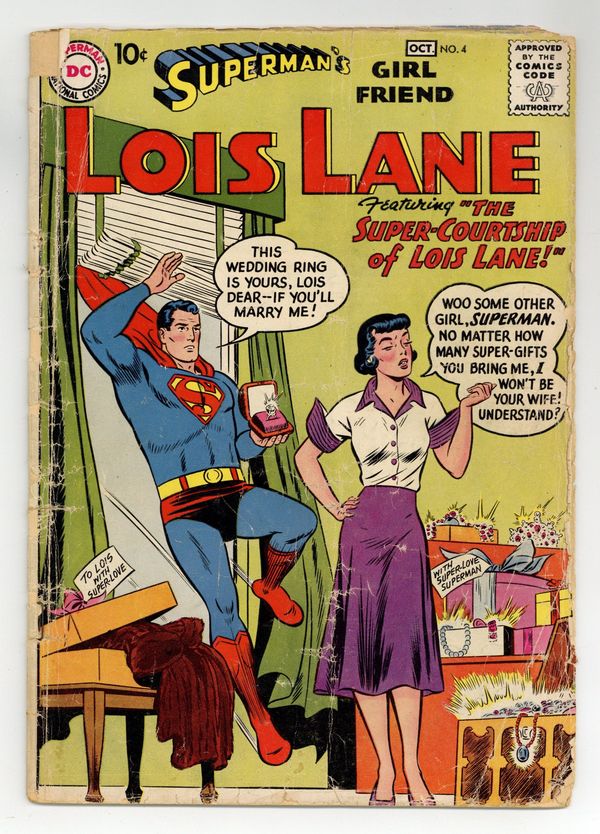Cover pencils by Curt Swan, inks by Stan Kaye. Super-Courtship of Lois Lane, script by Otto Binder, art by Kurt Schaffenberger; Trying to be helpful, Jimmy uses a doctored tape of Clark's voice to hypnotize him into proposing to Lois, but when Lois refuses Clark, he tries again as Superman. Know Your Pet! public service announcement, script by Jack Schiff, art by Lou Cameron. Cora the Car Hop story by Henry Boltinoff. Lois Lane, Working Girl, script by Jerry Coleman, art by Kurt Schaffenberger; Lois is offered a starring role as a working girl in a play, but the director thinks she needs some practical experience, so he gets her a job in a pretzel factory. Annie Oakley Gets Her (Super) Man, script by Alvin Schwartz, pencils by Wayne Boring, inks by Stan Kaye; Lois gets amnesia and thinks she's Annie Oakley. 36 Pages, Full Color. Cover price $0.10.