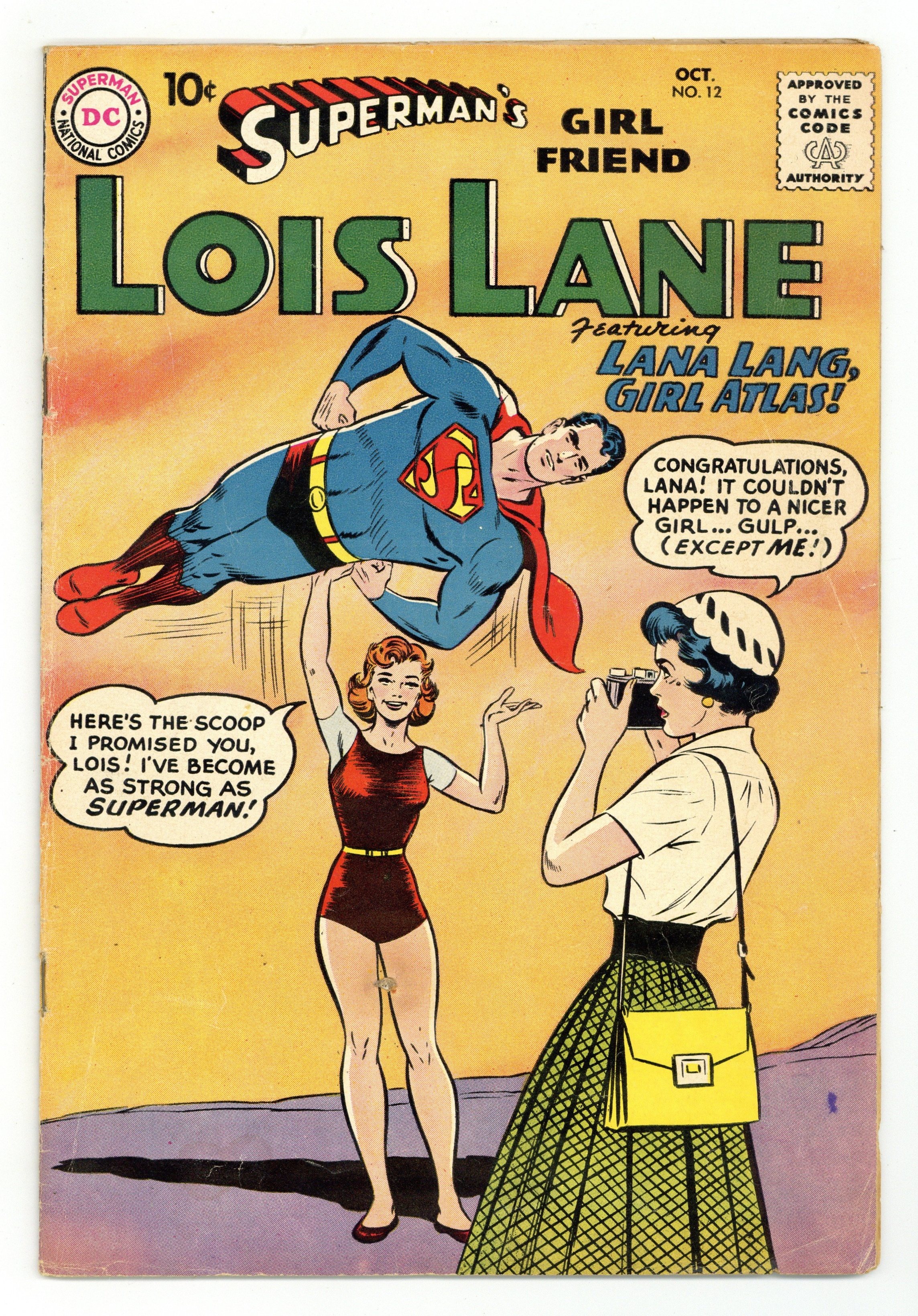 Cover pencils by Curt Swan, inks by Stan Kaye. The Mermaid from Metropolis!, script by Robert Bernstein, art by Kurt Schaffenberger; Lois Lane is rescued by Aquaman, but her injuries require emergency surgery that turns her into a mermaid. The Girl Atlas!, script by Robert Bernstein, art by Kurt Schaffenberger; Professor Morris' serum gives Lana Lang super-strength. Lois Lane Loves Clark Kent!, pencils by Al Plastino; After Lois decides Clark is Superman she tries to trick him into marrying her. 36 Pages, Full Color. Cover price $0.10.