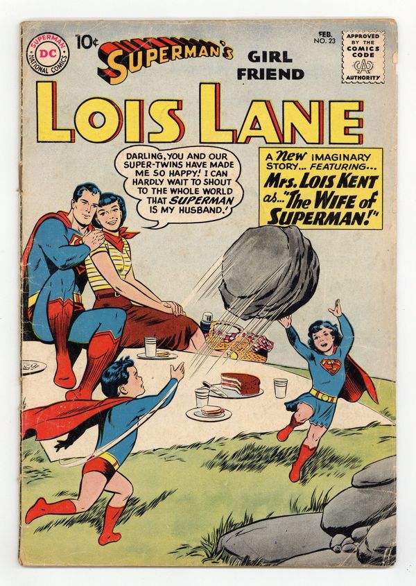 Cover pencils by Curt Swan, inks by Stan Kaye. The 10 Feats of Elastic Lass!, script by Otto Binder, art by Kurt Schaffenberger; Lois borrows Jimmy Olsen's serum and becomes Elastic Lass so she can catch the Wrecker, who has been blowing up statues around Metropolis. house ad for Superman Annual #2. The Curse of Lena Thorul!, script by Jerry Siegel, art by Kurt Schaffenberger; Strange events lead Lois to believe that librarian Lena Thorul is the reincarnation of a witch put to death in the seventeenth century. The Wife of Superman!, script by Jerry Siegel, art by Kurt Schaffenberger; Lois is jealous because Lana has taken her old job and also flirts constantly with Superman. 36 Pages, Full Color. Cover price $0.10.