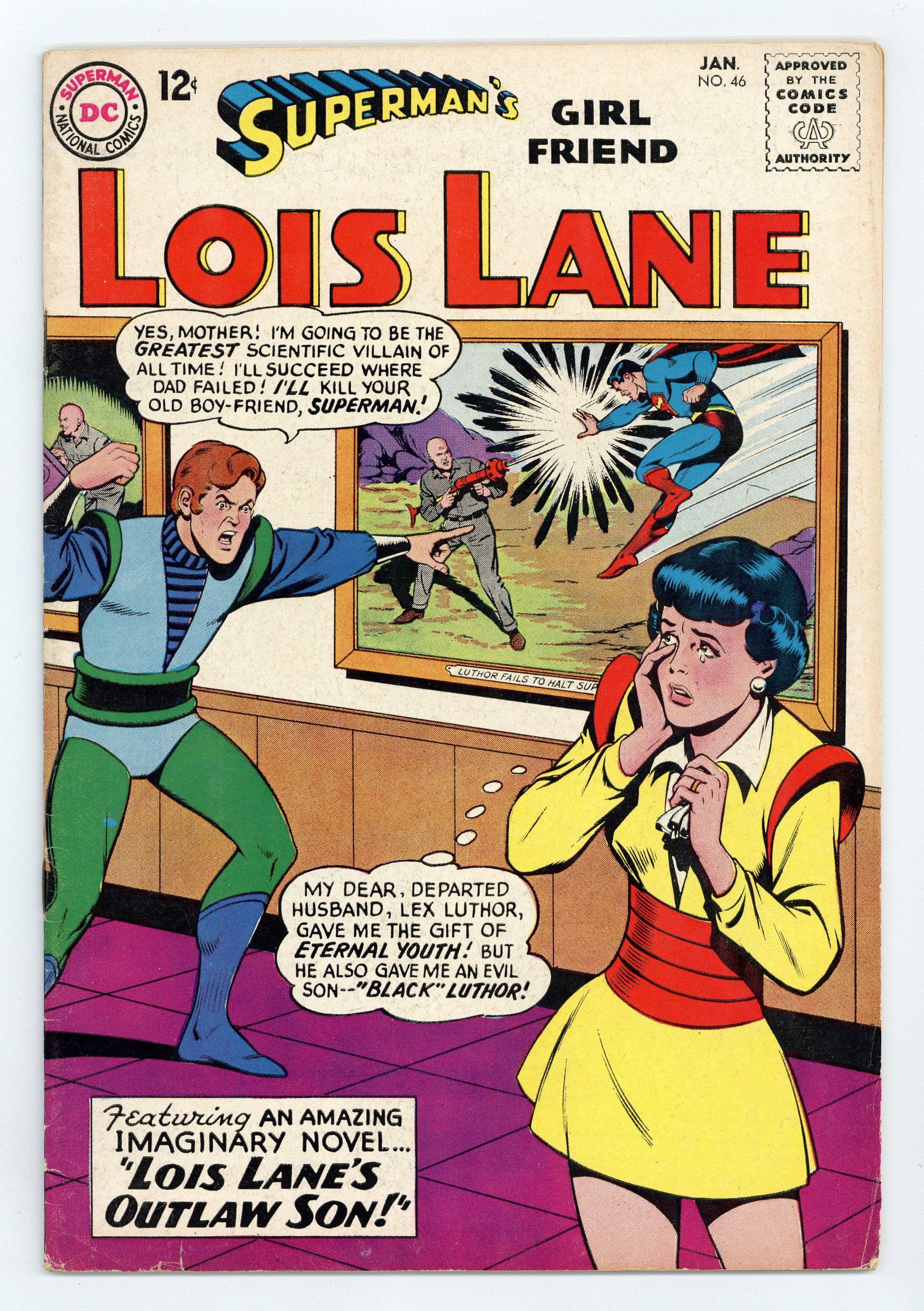 Cover art by Kurt Schaffenberger. Lois Lane's Outlaw Son! [Part 1], art by Kurt Schaffenberger; Lex Luthor is reformed and marries Lois Lane; Their son Larry Luthor turns evil and takes the name Black Luthor. The Fate of Superman's Daughter! [Lois Lane's Outlaw Son! Part 2]; Joan tries to convince Larry Luthor to give up his life of crime. The Wedding of Lois' Son and Superman's Daughter! [Lois Lane's Outlaw Son! Part 3]; Larry Luthor saves his mother and the Earth from Ironclaws' plan. House ad for Adventure Comics #316. 36 Pages, Full Color. Cover price $0.12.