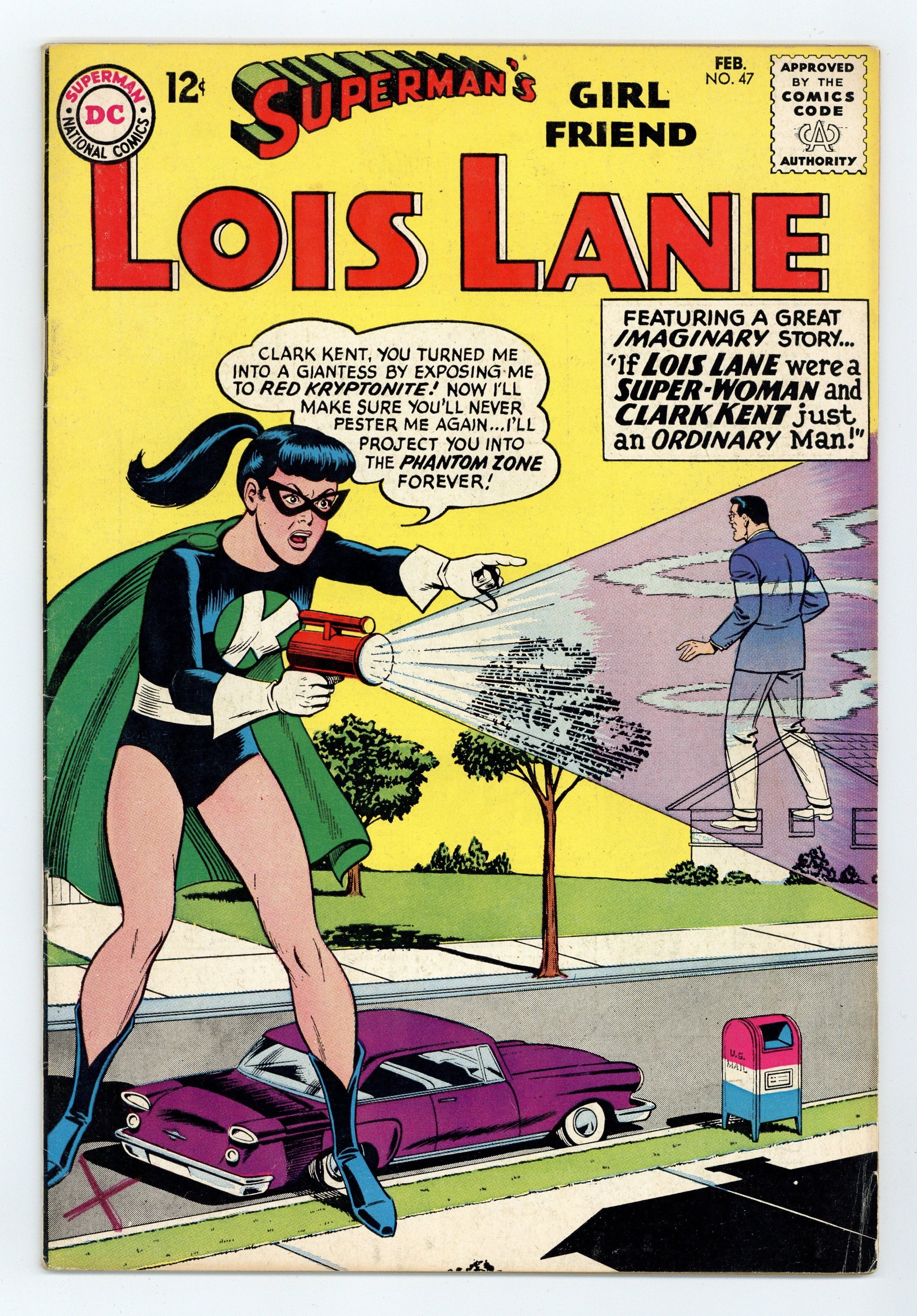 Cover art by Kurt Schaffenberger. The Incredible Delusion!, art by Kurt Schaffenberger; Lois believes that the Perry White that has returned from vacation is an imposter. Special Christmas Quiz, script by Jack Schiff, art by Ruben Moreira. Lois Lane's Jungle Jeopardy!, art by Kurt Schaffenberger; Lois Lane travels to the Amazon with the Peace Corps; Secretly she is on the trail of the jewel thief Stace Lorin. The Super-Life of Lois Lane!, art by Kurt Schaffenberger; Lois Lane uses a super-computer to view what life would have been like if she was from Krypton instead of Clark. House ad for The Brave and the Bold #52. 36 Pages, Full Color. Cover price $0.12.