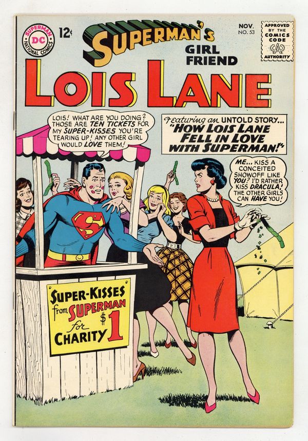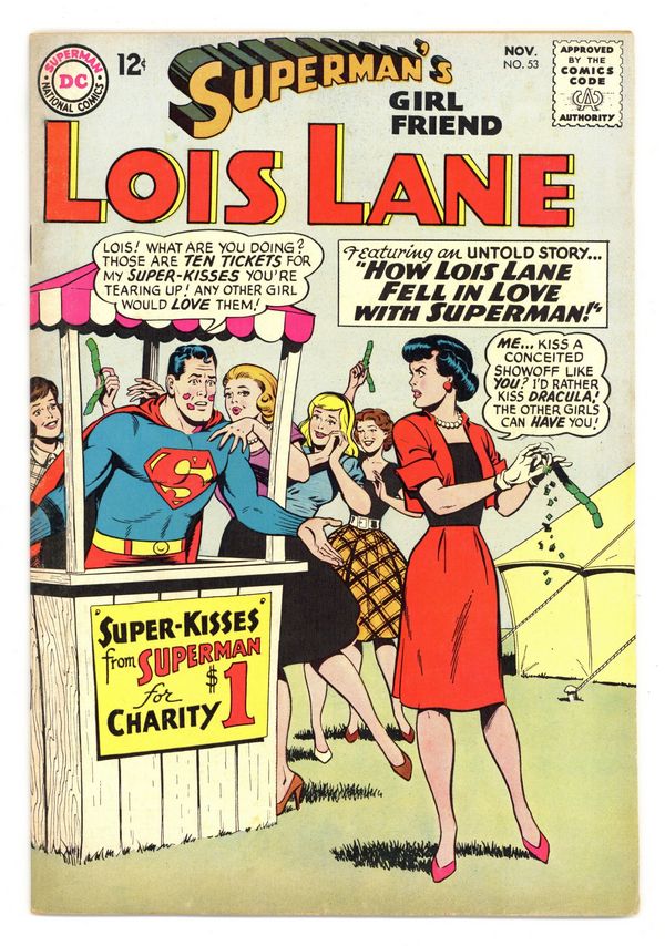 Cover art by Kurt Schaffenberger. How Lois Lane Fell in Love with Superman!, art by Kurt Schaffenberger; In this flashback story, Lois is unimpressed with the new hero Superman until Red Kryptonite temporarily robs him of his powers and she sees that he is still a hero without them. Honesty is the Best Policy! public service announcement, script by Jack Schiff, art by Sheldon Moldoff. Superman's Home-Town Sweetheart!, art by Kurt Schaffenberger; Lois goes to Smallville to interview girls who dated Superboy, and finds that one of them, Lydia Lawrence, is still carrying on a romance with Superman! Lois Lane's Transformations article. When Lois and Lana Were Brides!, art by Kurt Schaffenberger; When a plane crash maroons Lois, Clark, and Lana in a remote valley in England, they meet a strange group of men who insist that all women must be married under their law, and proceed to match Lois with Clark, and Lana with a man of their clan. Rocky and Bullwinkle star in a one-page Cheerios ad. 36 Pages, Full Color. Cover price $0.12.