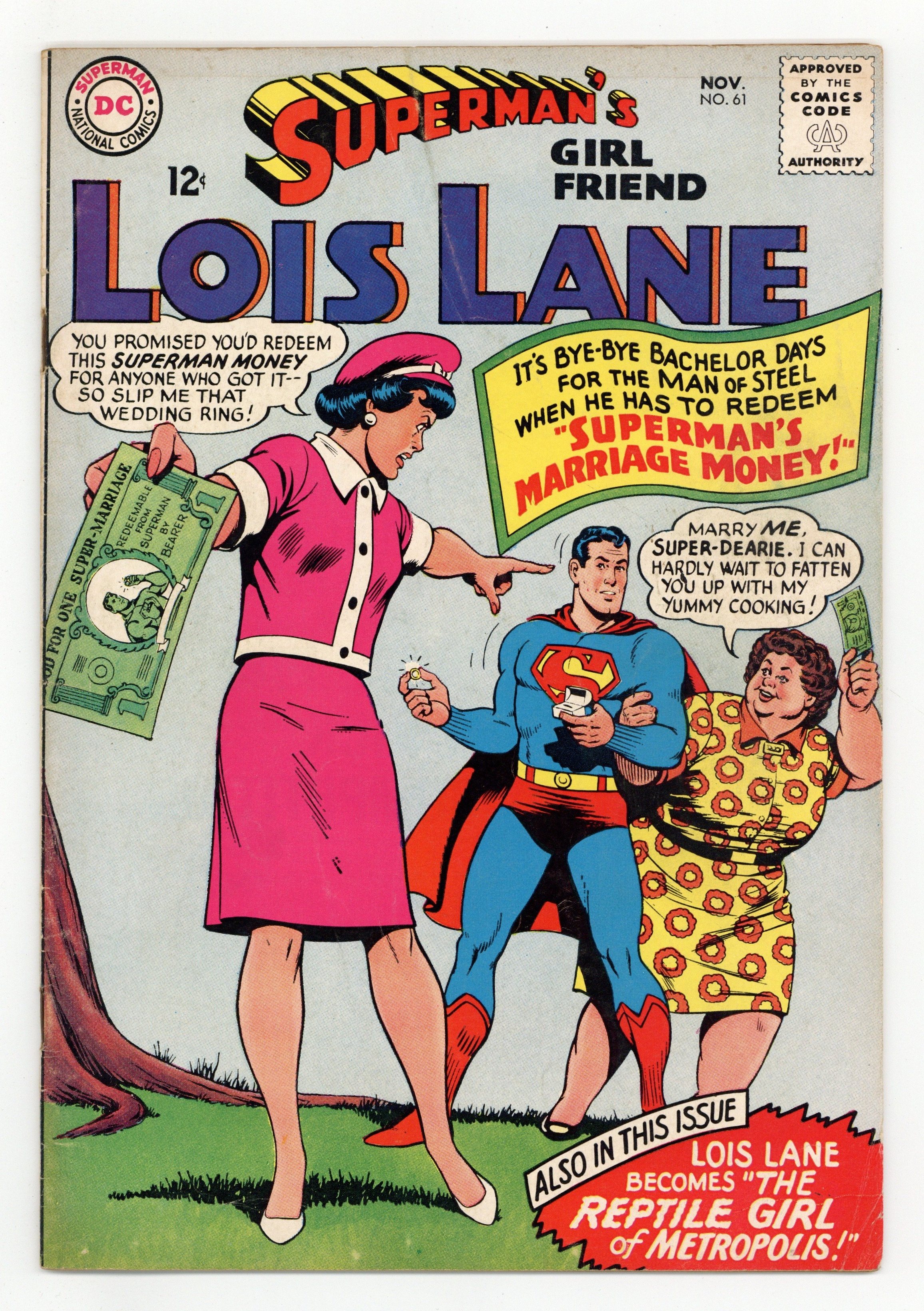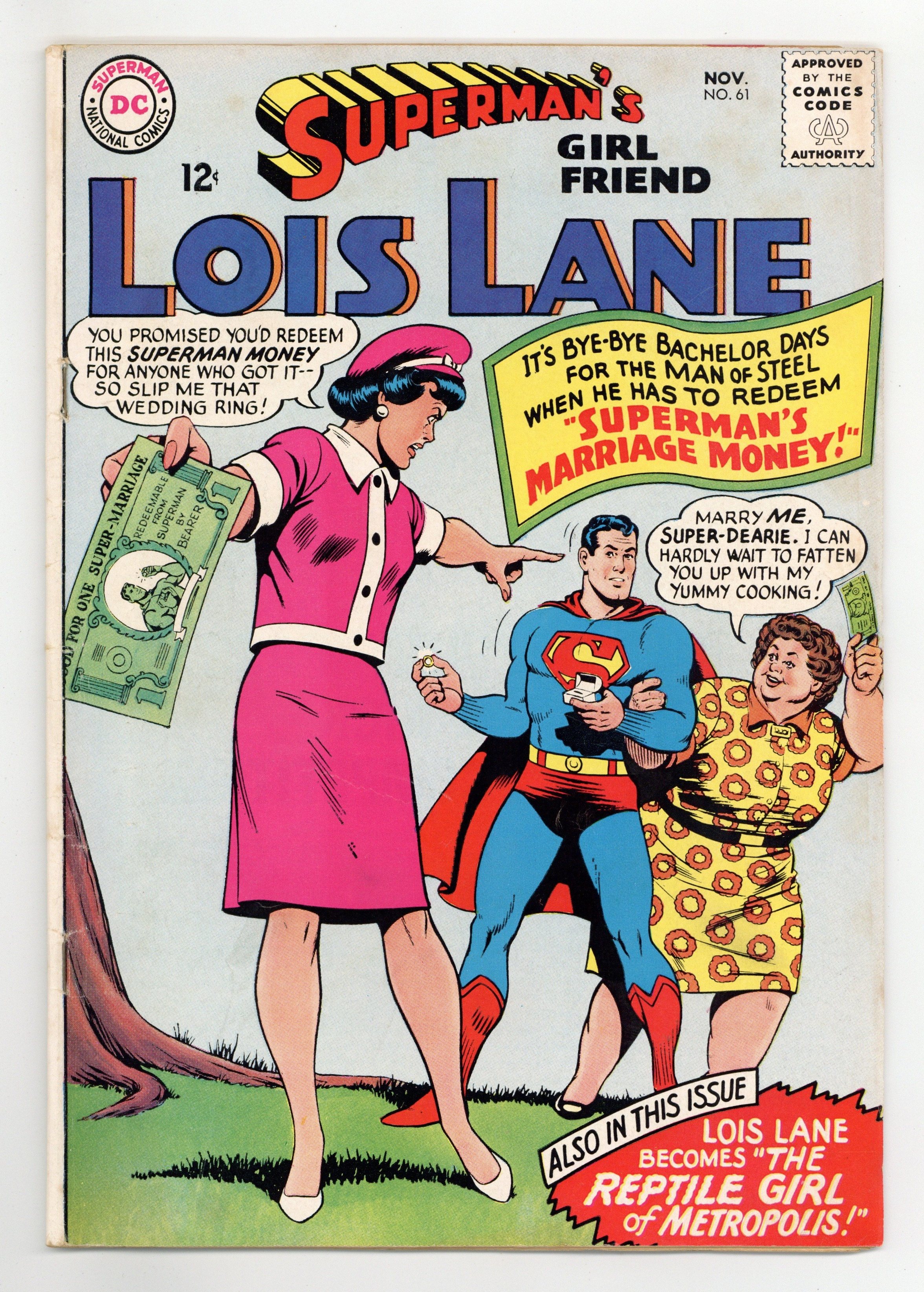 Cover art by Kurt Schaffenberger. Superman's Marriage Money!, script by Otto Binder, art by Kurt Schaffenberger; Mxyzptlk tricks Superman into doing super-feats by passing out "Superman Money" that can be redeemed for a Super Feat. Lois receives one that allows her to marry Superman. Ad for AMT models. Rocky and Bullwinkle Cheerios ad. The Hip Way to Learn! public service announcement, script by Jack Schiff, art by Sheldon Moldoff. The Reptile Girl of Metropolis!, script by Leo Dorfman, art by Kurt Schaffenberger; The world believes that Lois has been turned into a reptile girl during an accident during a nuclear test, but she has in fact been kidnapped and replaced with an impostor. The Secret of the Reptile Girl! [The Reptile Girl of Metropolis! Part II]; Lois learns who kidnapped and replaced her with an impostor that appeared to have reptilian skin. Rocky and Bullwinkle star in a one-page Cheerios ad. 36 Pages, Full Color. Cover price $0.12.