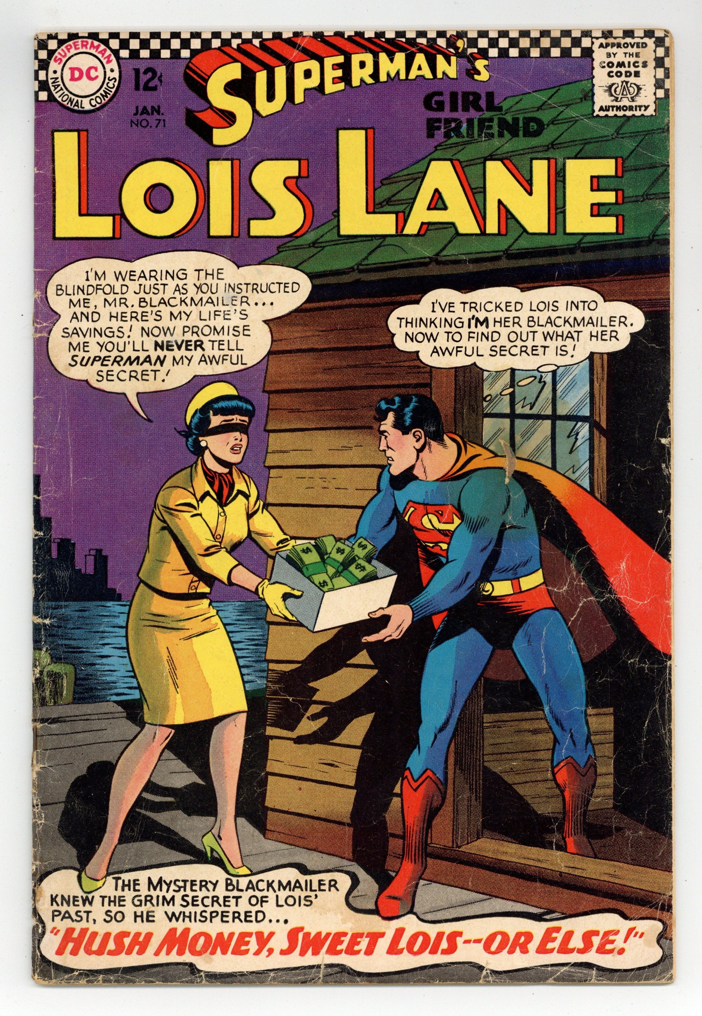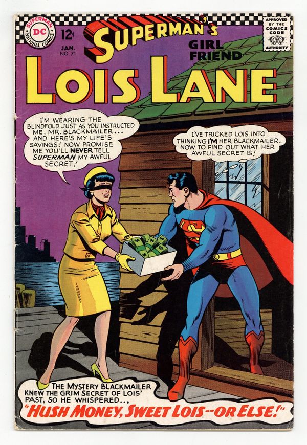2nd Silver Age appearance of Catwoman. Cover art by Kurt Schaffenberger. Bad Luck for a Black Super-Cat!, script by Leo Dorfman, art by Kurt Schaffenberger; Catwoman refuses to tell Lois how to change Superman back from his feline form, even after she is jailed. Captain Action ad, art by Kurt Schaffenberger. House ad for Superman #193, pencils by Curt Swan, inks by George Klein. Hush Money, Sweet Lois -- Or Else!, script by Otto Binder, art by Kurt Schaffenberger; Roger Madison tries to blackmail Lois Lane into marrying him, but it's not her shameful secret she's protecting--it's one of Superman's. House ad for Showcase #66. Champs Against Odds! public service announcement with Mickey Mantle, Wilma Rudolph, and Ben Hogan, script by Jack Schiff, art by Sheldon Moldoff. House ad for House of Mystery #163. Adventures in the GI Joe Club ad, art by Irv Novick. 36 Pages, Full Color. Cover price $0.12.