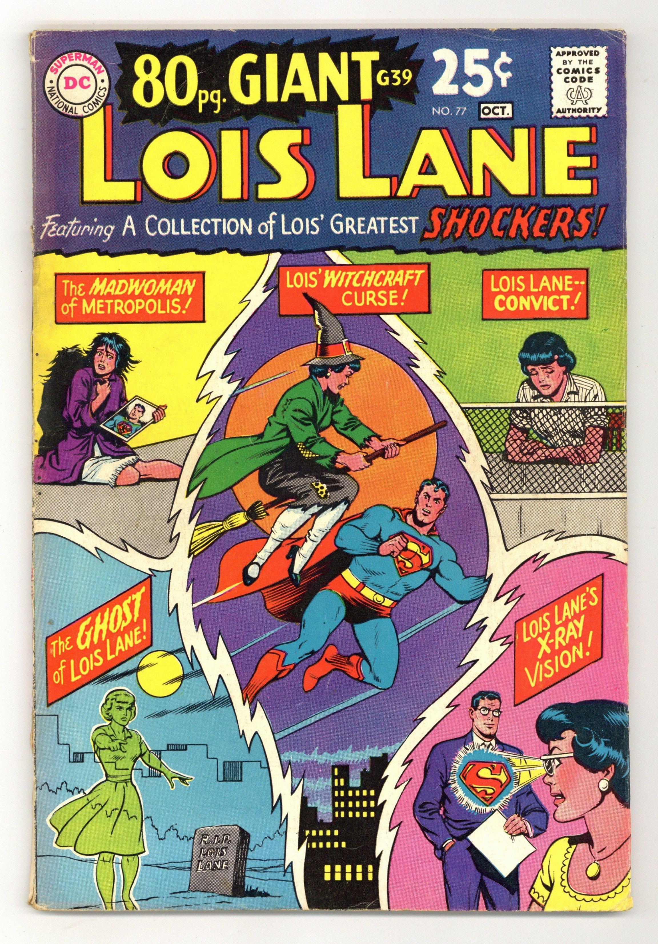 Cover art by Kurt Schaffenberger. House ad for Tomahawk #112. The Witch of Metropolis, script by Otto Binder, art by Kurt Schaffenberger; Lois thinks she turns into a witch at night. Lois Lane – Convict, script by Bill Finger, art by Kurt Schaffenberger; Lois takes a bribe and is forced into crime by Baldy Pate. House ad for Showcase #70. The Six Lives of Lois Lane!, script by Bill Woolfolk, pencils by Wayne Boring, inks by Stan Kaye; After an accident Lois Lane believes she's various famous women from history. The Mad Woman of Metropolis!, script by Robert Bernstein, art by Kurt Schaffenberger; "Killer" Meigs' men try to convince Lois she is going insane to get revenge for her helping put their boss in prison. Lois Lane's X-Ray Vision!, script by Robert Bernstein, art by Kurt Schaffenberger; An accident causes Lois' glasses to become X-Ray glasses. Major Matt Mason ad. The Ghost of Lois Lane, script by Jerry Coleman, pencils by Wayne Boring, inks by Stan Kaye; House ad for World's Finest Comics #169, pencils by Curt Swan. Lois Lane's Darkest Secret!, script by Robert Bernstein, art by Kurt Schaffenberger. The Fattest Girl in Metropolis, script by Otto Binder, art by Kurt Schaffenberger. 84 Pages, Full Color. Cover price $0.12.