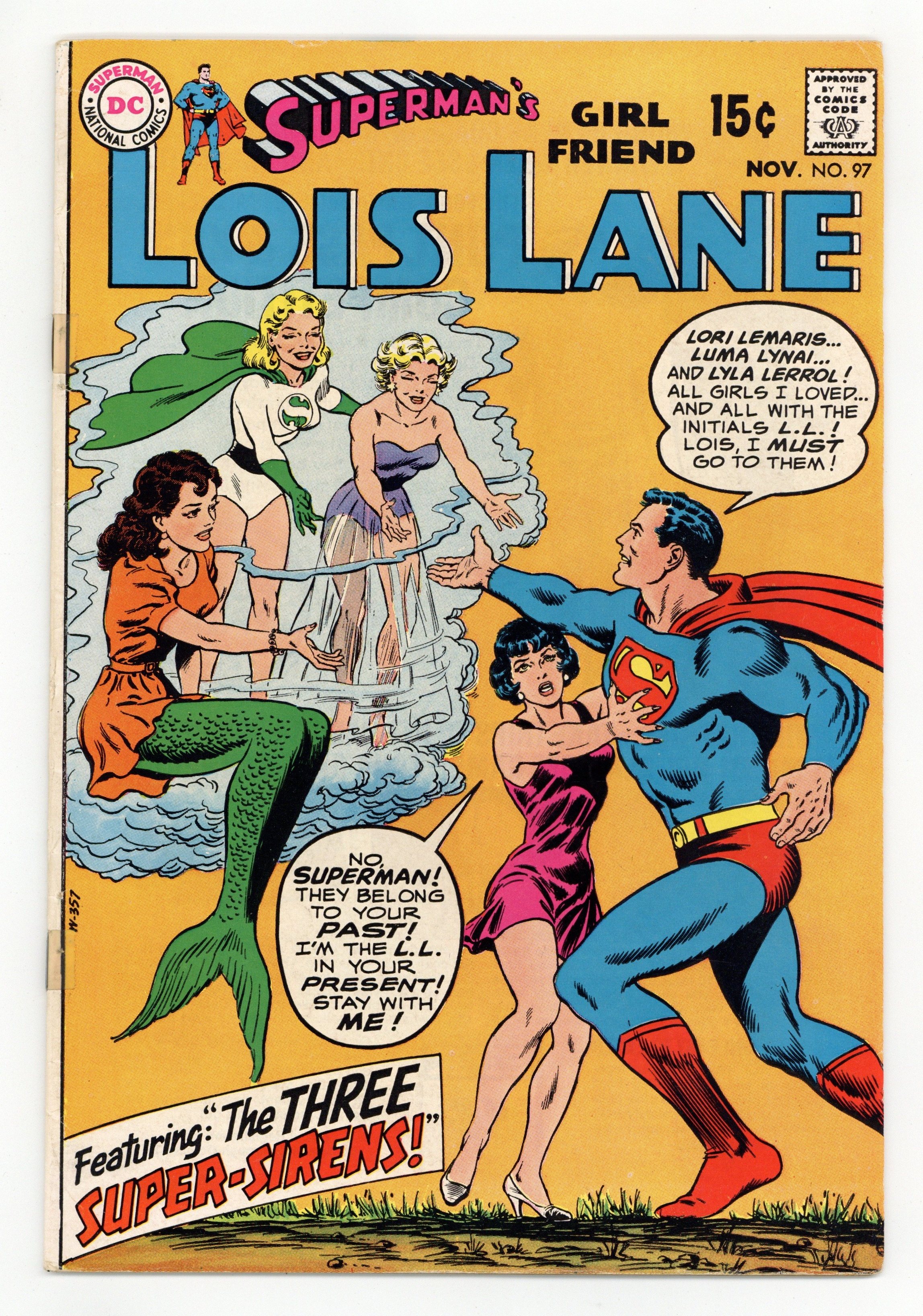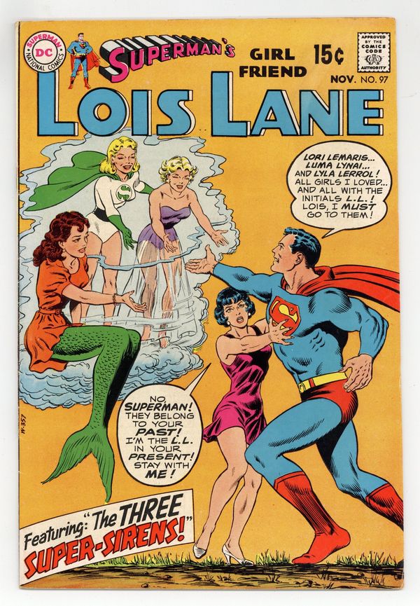 Tags: Superman$26.00Cover pencils by Curt Swan, inks by Murphy Anderson. The Three Super-Sirens! [Part I], pencils by Irv Novick, inks by Mike Esposito; Clark and Lois investigate a sea monster sighting, and arrive to find Lori Lemaris sending it away by telepathy. Part II The Lure of the Three Loreleis!; After both Lyla Lerrol and Luma Lynai appear and remind Superman of their past love, Lois figures out that the girls are all shapeshifting alien criminals from the planet Durla who are trying to drive Superman mad. The Mystery of Skull Island, script by Robert Bernstein, art by Kurt Schaffenberger; Perry has Clark and Lois disguise themselves as a butler and maid in order to spy on Hollywood movie star Carlos Floyd. Peg humor page by Henry Boltinoff. 36 Pages, Full Color. Cover price $0.15.