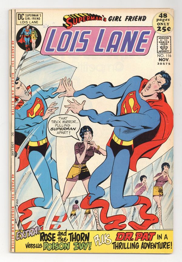 Tags: Superman$19.25Cover pencils by Werner Roth, inks by Vince Colletta. Hall of 1000 Mirrors, script by Robert Kanigher, pencils by Werner Roth, inks by Vince Colletta and Murphy Anderson (Superman heads only); Desaad kidnaps Lois and Dave Stevens in order to lure Superman to Happyland, the deserted amusement park where he uses the science of Apokolips against the Man of Steel. A Cure for Romance!, script by Robert Kanigher, pencils by Carmine Infantino, inks by Frank Giacoia; Dr. Pat Windsor's busy career leaves her with no time for the men who are intrigued by her. D.C. Sweeps A.C.B.A. Awards ad, art by Neal Adams. Computed to Kill, script by Robert Kanigher, art by Dick Giordano; The super-computer K.A.R.L. comes up with a plan to eliminate the Thorn for Poison Ivy, who hopes to use it next against Batman. 52 Pages, Full Color. Cover price $0.25.