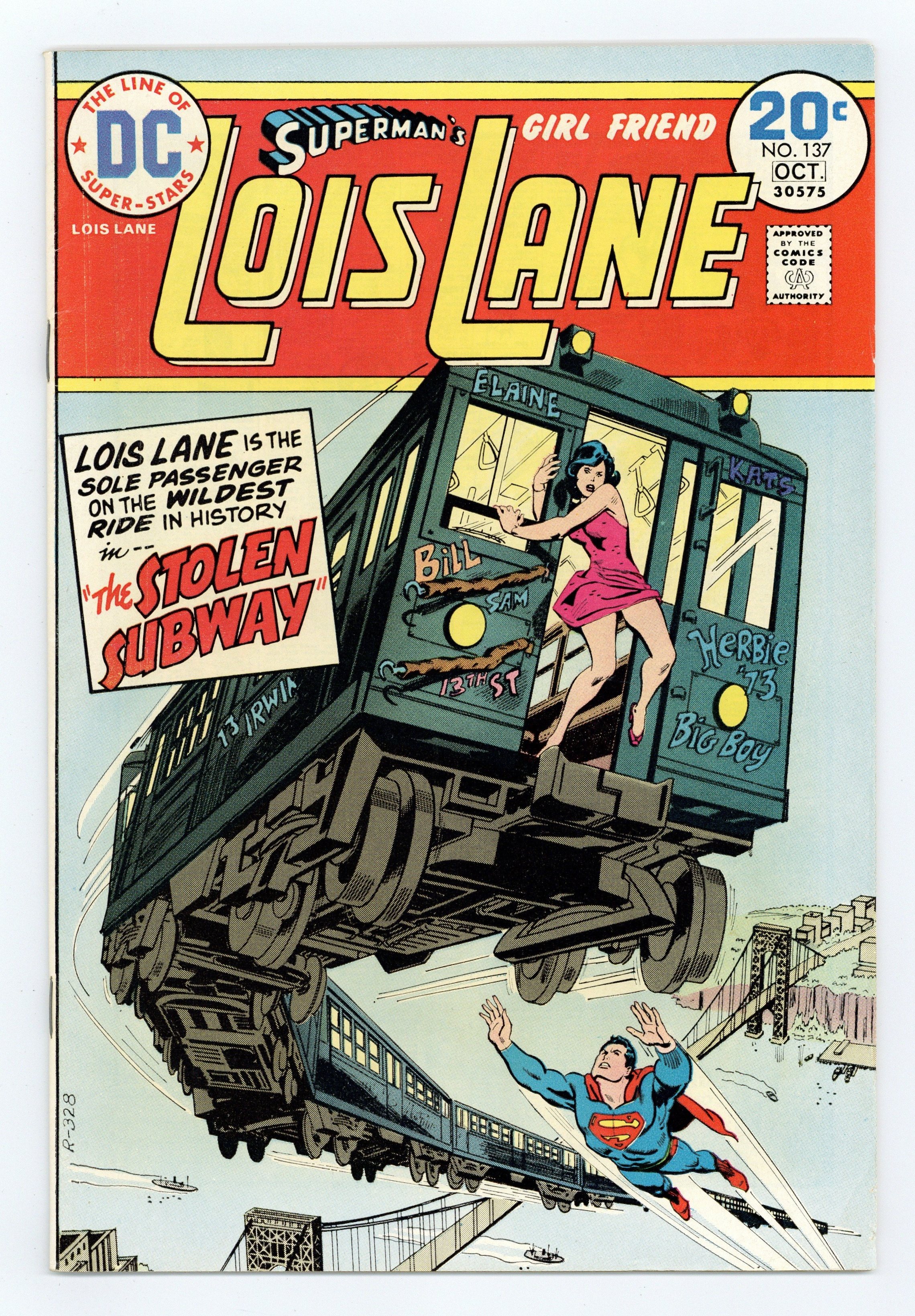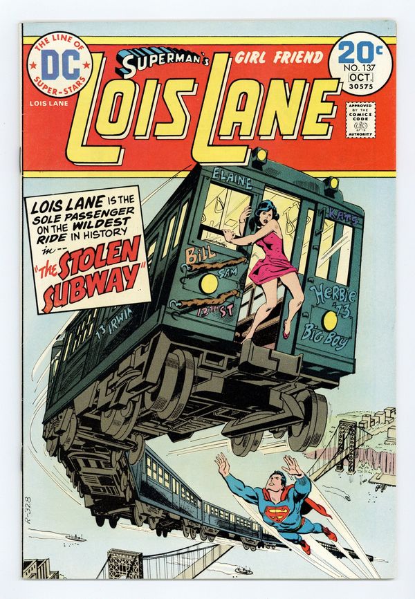 Tags: Superman$11.50Cover by Bob Oksner. Written by Cary Bates and John David Warner. Art by John Rosenberger and Vince Colletta. Lois is kidnapped by other-dimensional aliens using a vehicle that looks like a subway train in "The Stolen Subway!" by Cary Bates, John Rosenberger and Vince Colletta. Starring Lois Lane, Superman (Clark Kent) and Perry White. Plus: Lois and Melba help an elderly couple when a crooked developer is trying to drive them out of their home in "The Building is Dead" by John David Warner, Rosenberger and Colletta. Starring Lois Lane, Superman and Melba Manton. 36 Pages, Full Color. Cover price $0.20.