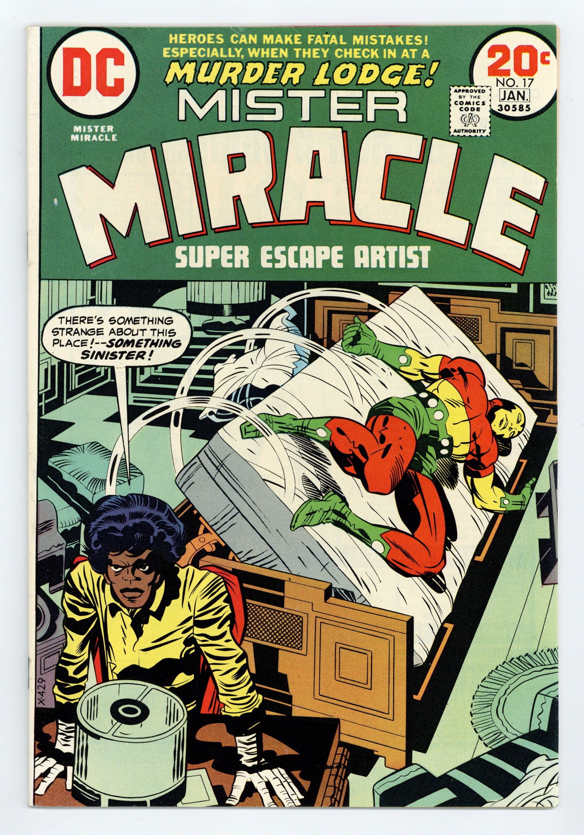 "Murder Lodge." Mister Miracle and company check into the Murder Lodge and engage in battle with Mad Merkin, Della the Dinosaur, and Little Bullets. Script, pencils, and cover by Jack Kirby. Inks by Mike Royer. Cover price $0.20.