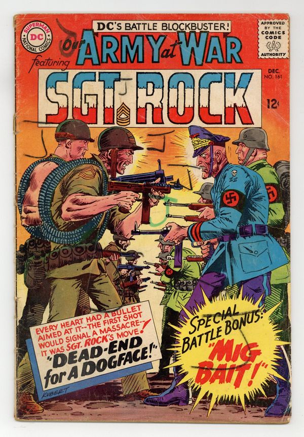 Cover art by Joe Kubert. Dead End For A Dogface starring Sgt Rock, script by Bob Kanigher, art by Joe Kubert. It's Sgt. Rock's move while everyone is pointing their gun at one another. MIG Bait, script by Hank Chapman, pencils by Ross Andru, inks by Mike Esposito. 36 Pages, Full Color. Cover price $0.12.